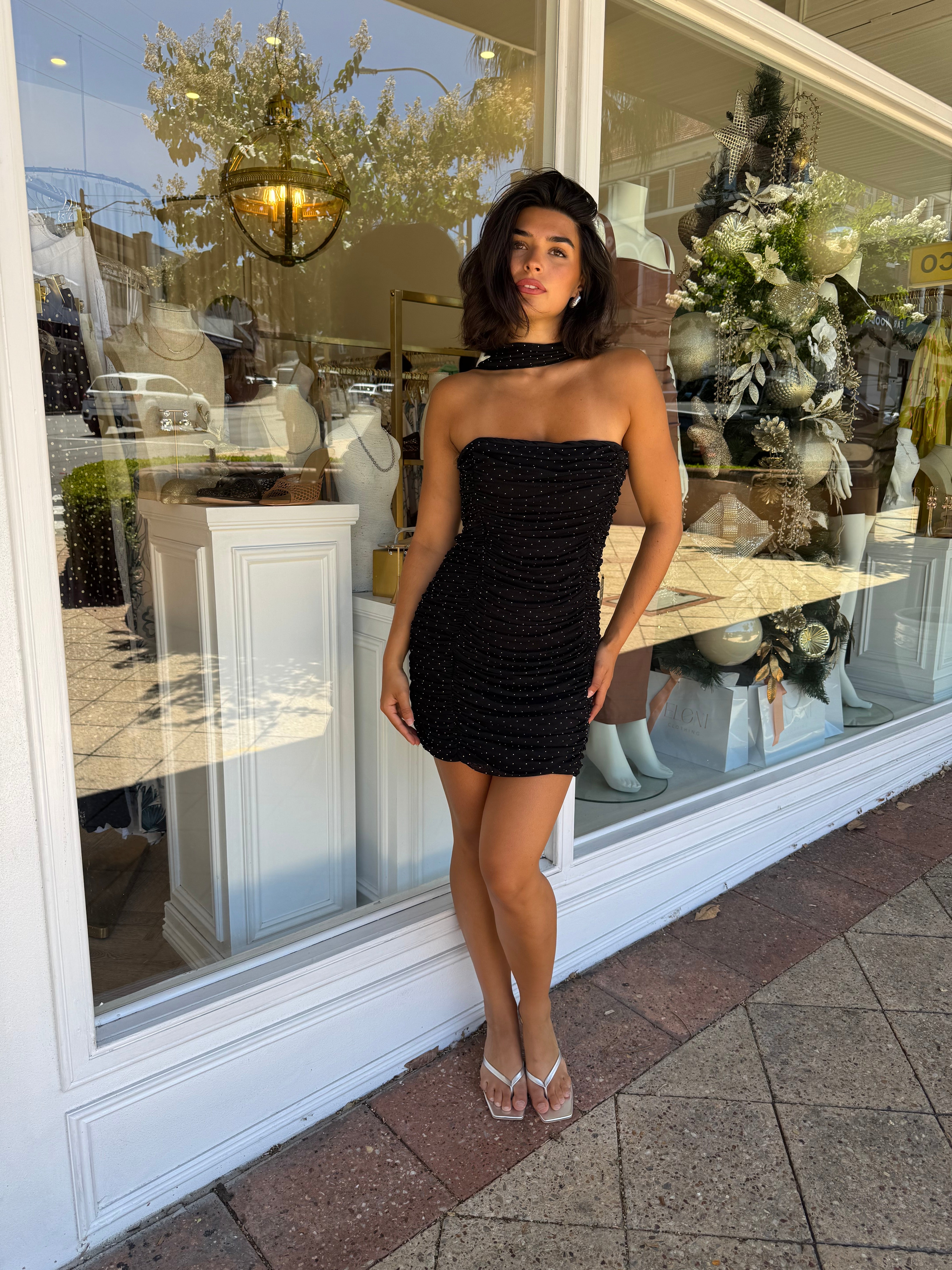 Incredible body-con mini with structured bodice and removable neck tie. Crafted in our signature crystal mesh, it features flattering gathers throughout the body and invisible zip at back. Fully lined.