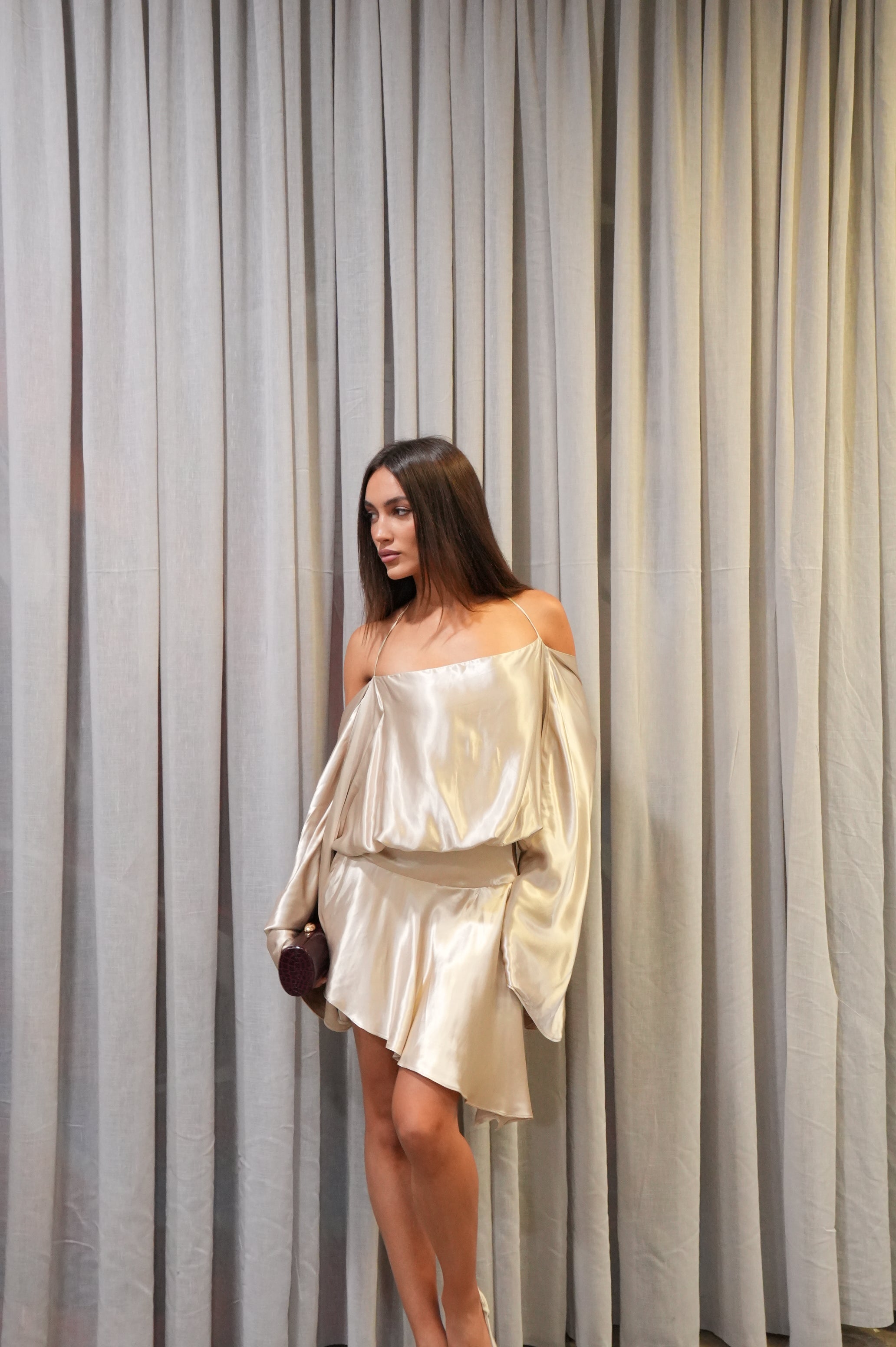 Crafted from silk-like fabrication, the Bell Mini Dress is fully lined and features a sculptural waterfall drape with an invisible side zip for a seamless finish. With its soft hand-feel and fluid movement, it's an elevated mini designed for modern sophistication.