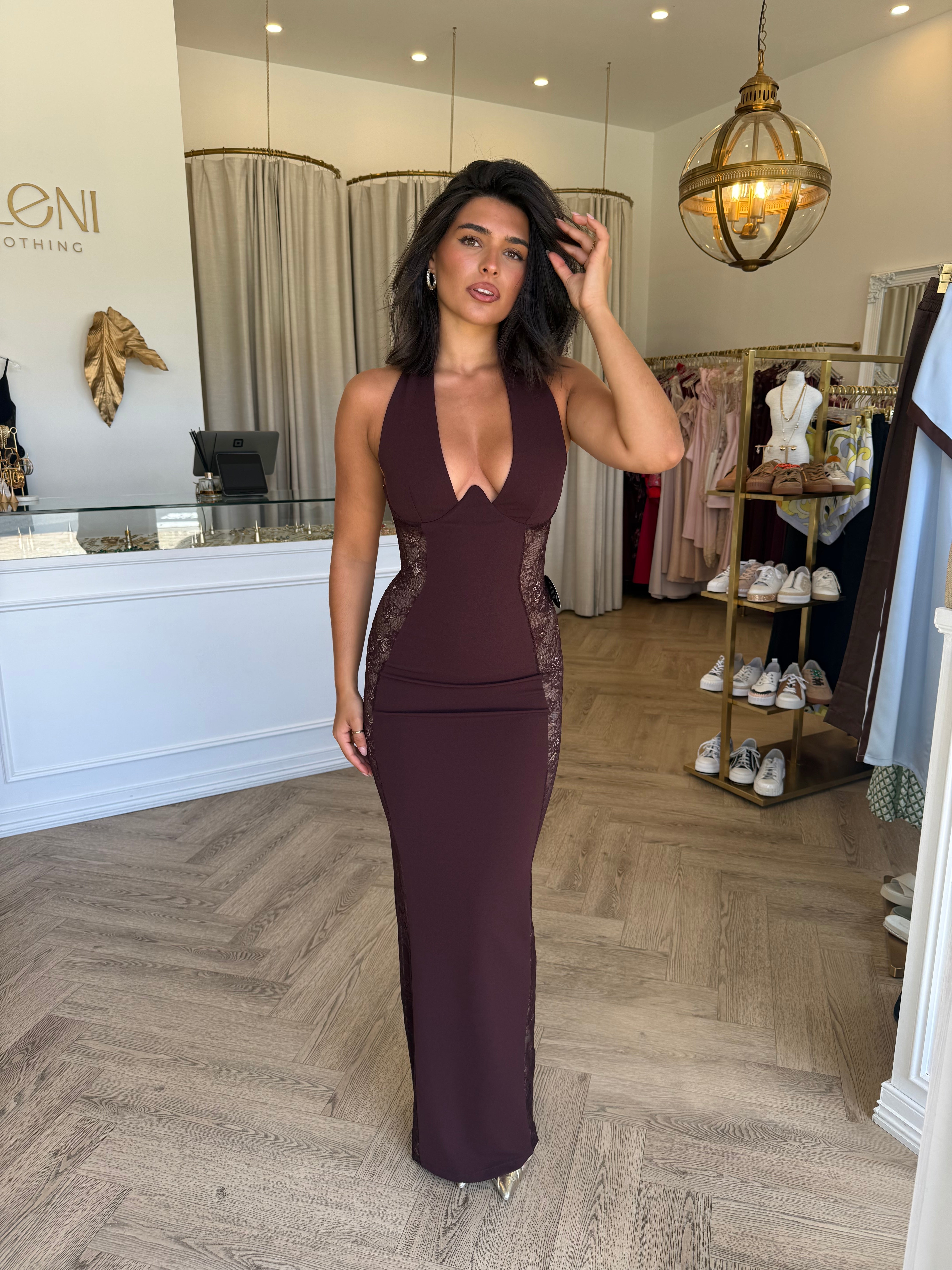 Gown Sculpted fit Halter neckline Lace side panels Underwire feature Boned bodice Fully lined Centre back logo...