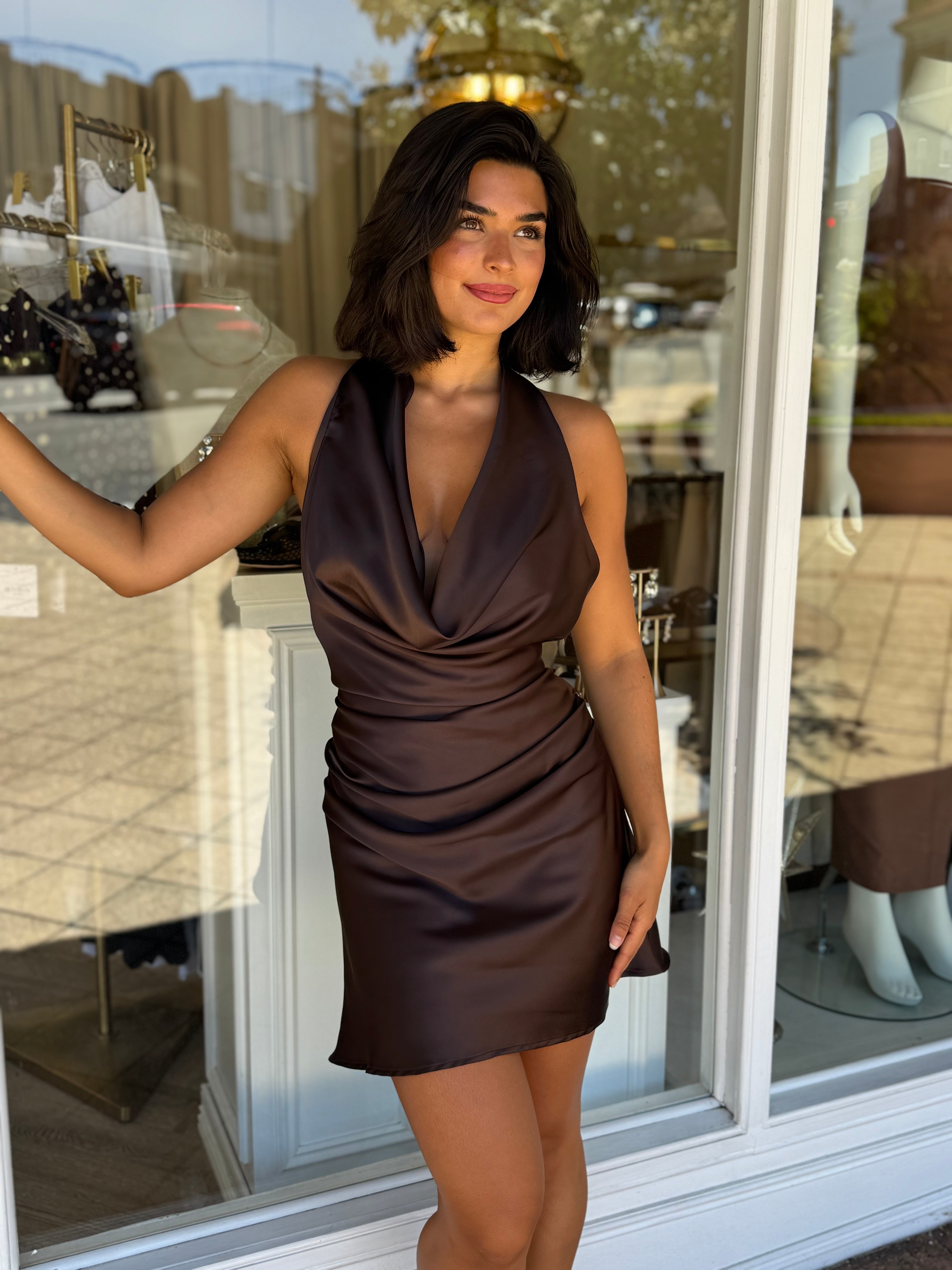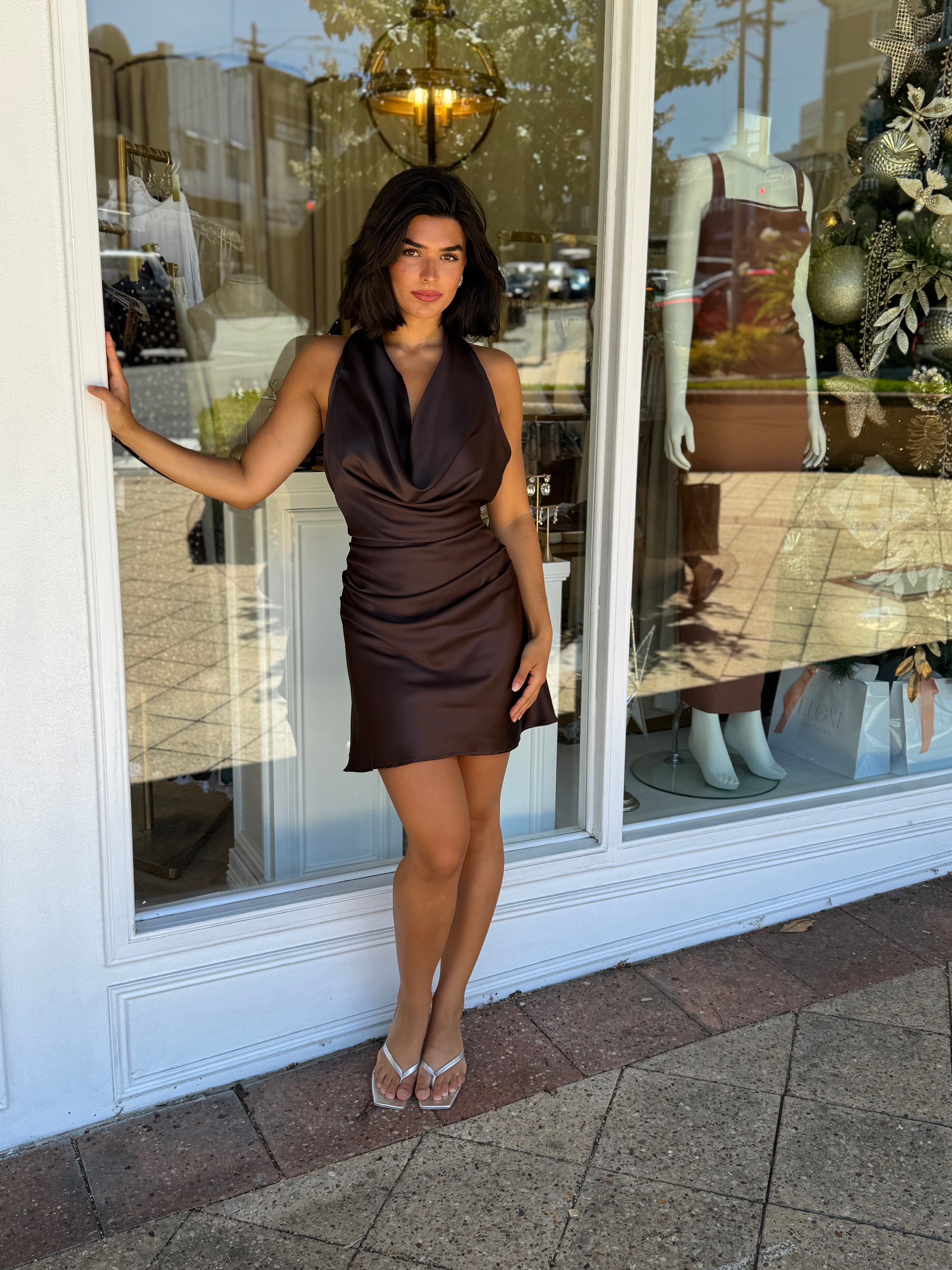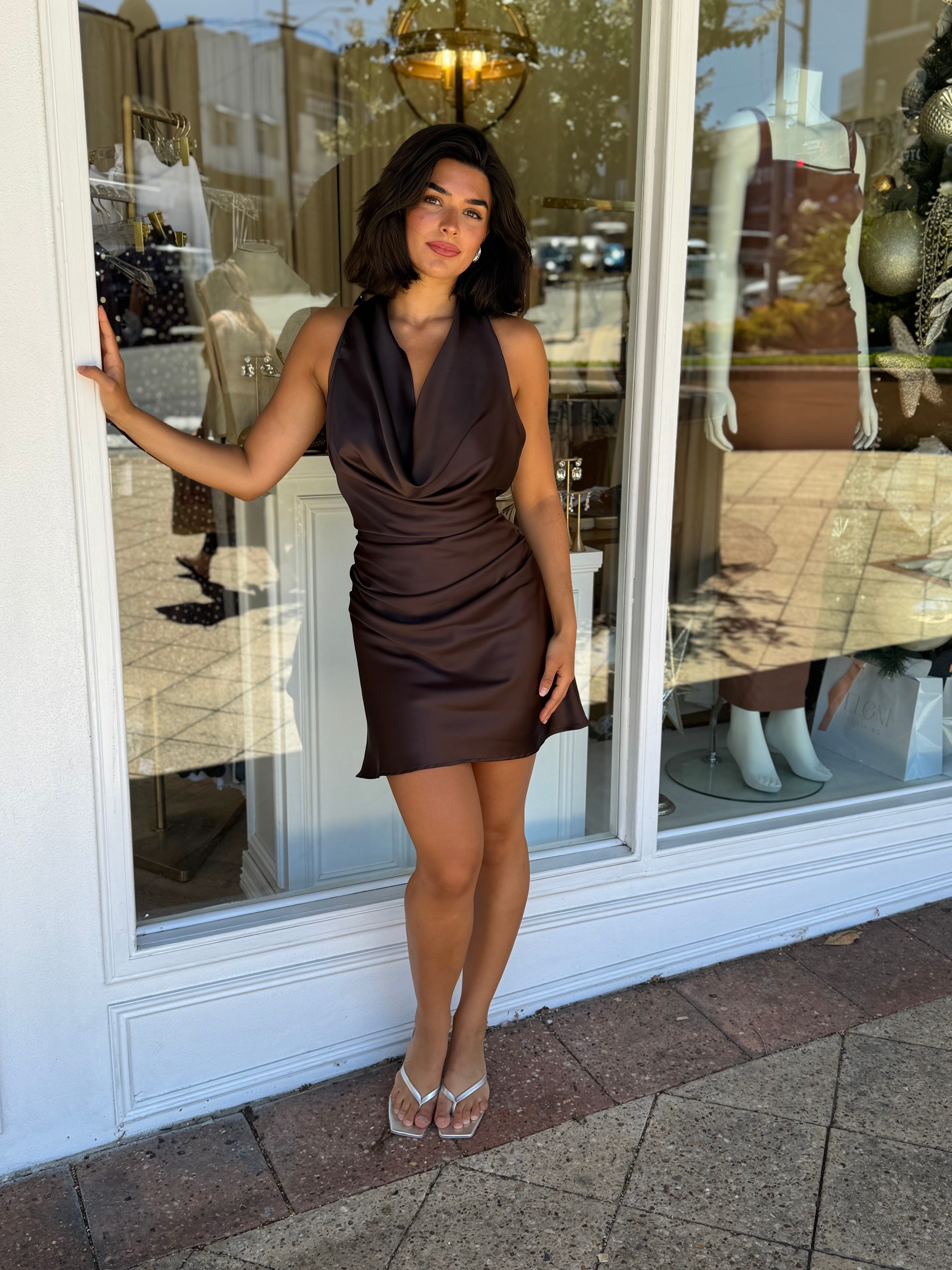 Bring the party in this sexy bias-cut satin mini, with a draped hater neckline and gorgeous low back. Featuring flattering tucks at front hip, a fine rouleau tie to nip in the waist and separate neck scarf. Invisible zip at back waist, bodice is lined.