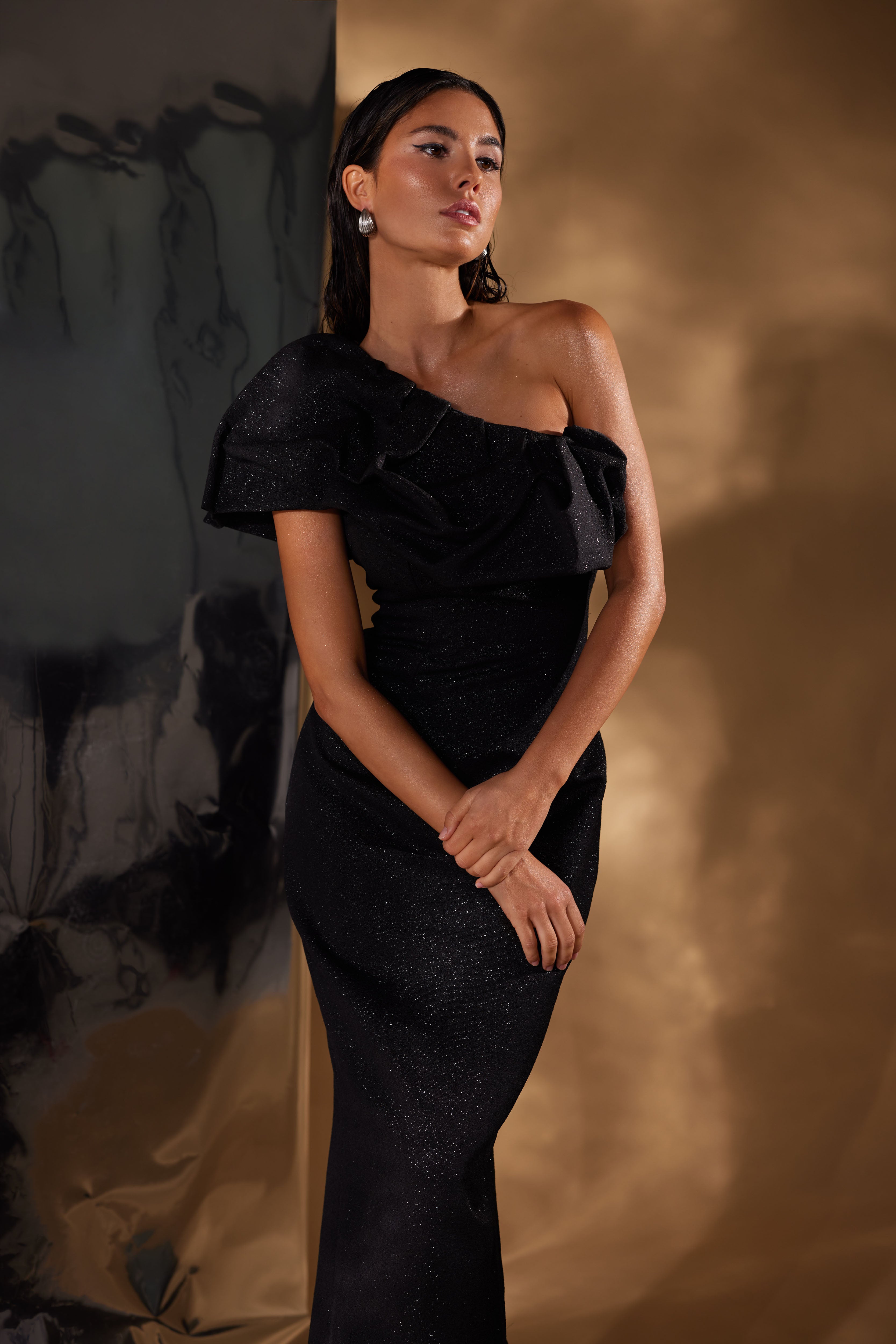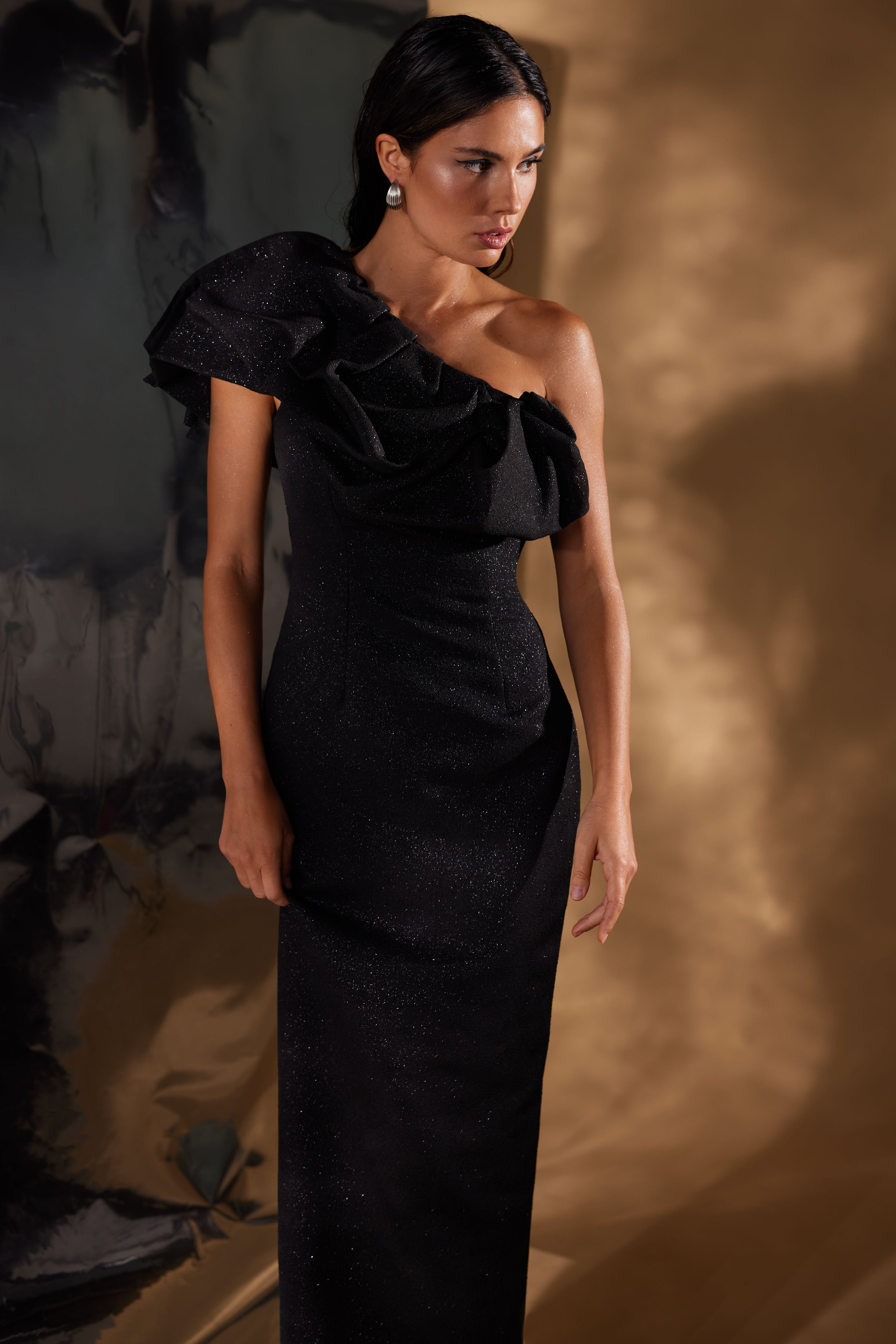 This striking one-shoulder gown makes a bold statement in shimmering Rose gold. Its ruffled shoulder detail and form-fitting shape ensure a memorable entrance. Also avialable in blush