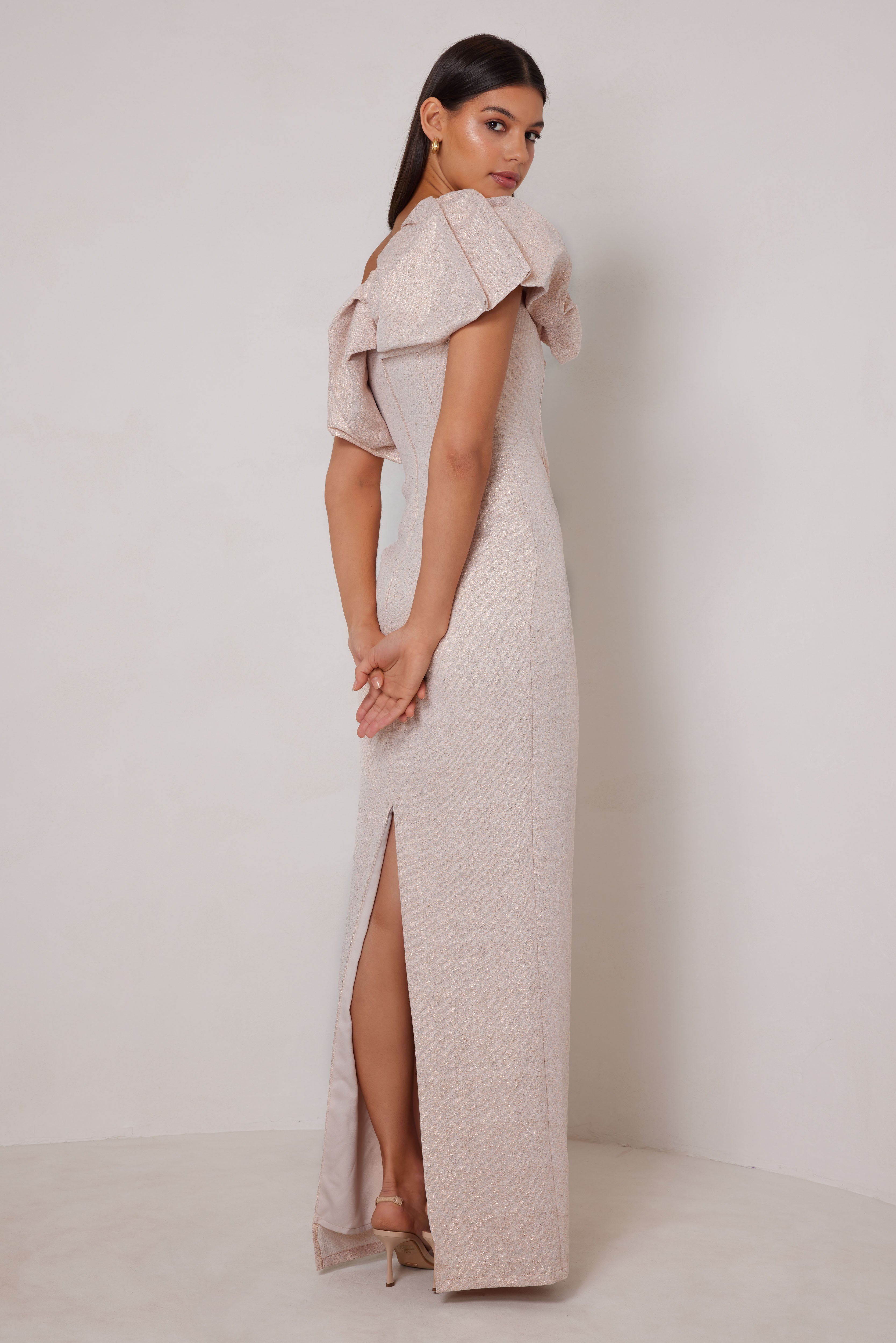 This striking one-shoulder gown makes a bold statement in shimmering Rose gold. Its ruffled shoulder detail and form-fitting shape ensure a memorable entrance. Also avialable in Black
