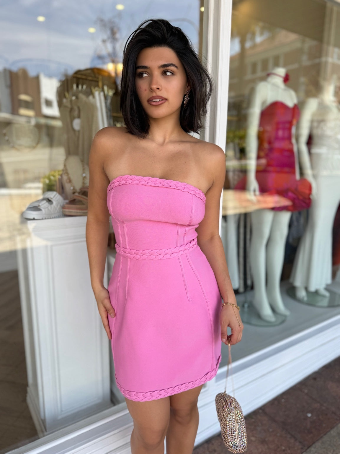 - Strapless neckline offering a clean, structured finish- Braiding at seams adds subtle texture and contour- Unlined...