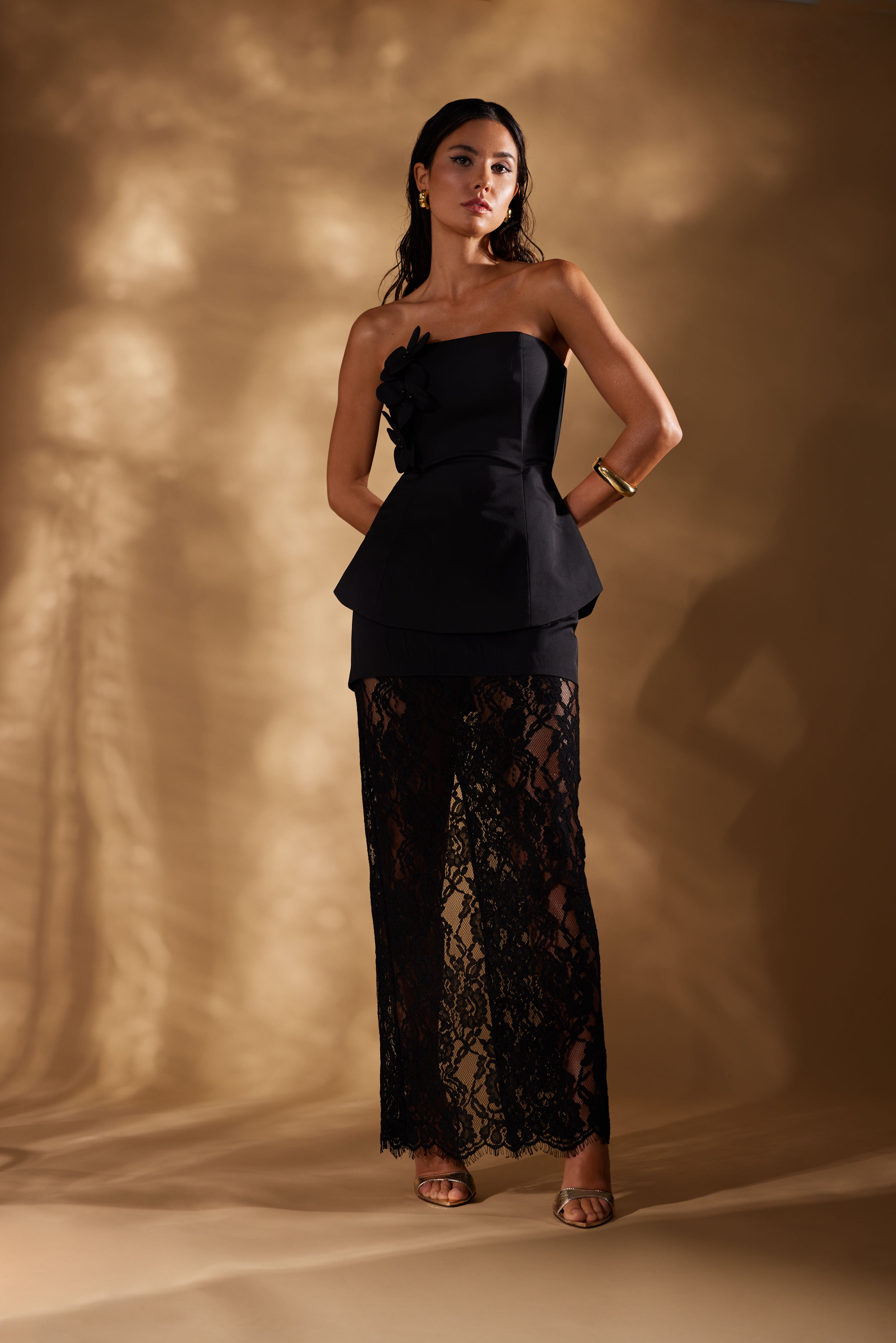Introducing Darren set featuring a structured bodice adorned with delicate flowers and form-fitting silhouette paired elegantly with the high-waisted lace skirt. Also available in Peony Pink