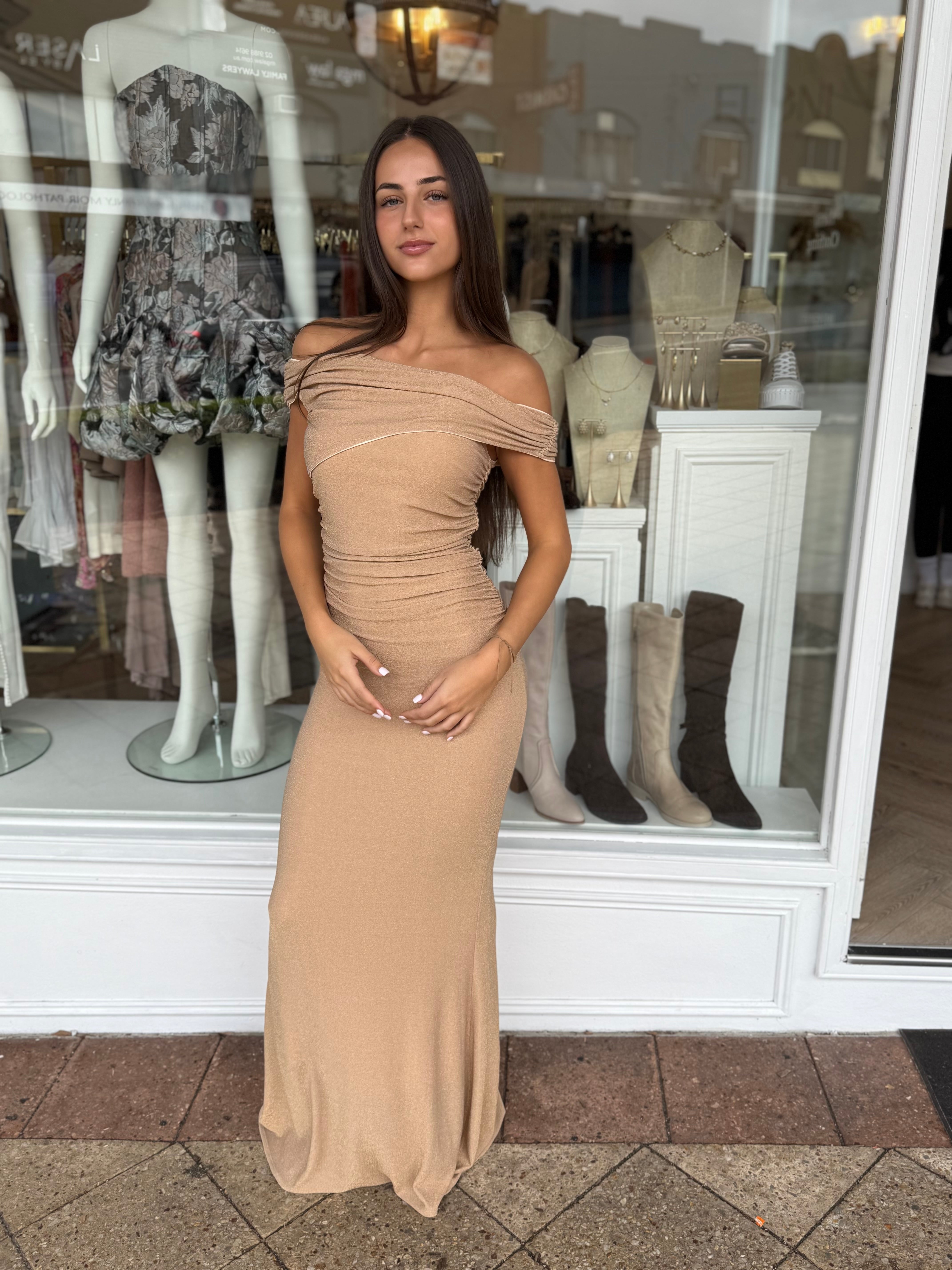 Introducing our stunning off-the-shoulder evening gown. This elegant dress features a flattering ruched bodice that gracefully flows into a floor-length silhouette, accentuating your curves with its stretchy fabric. The subtle sparkle woven throughout adds a touch of glamour.