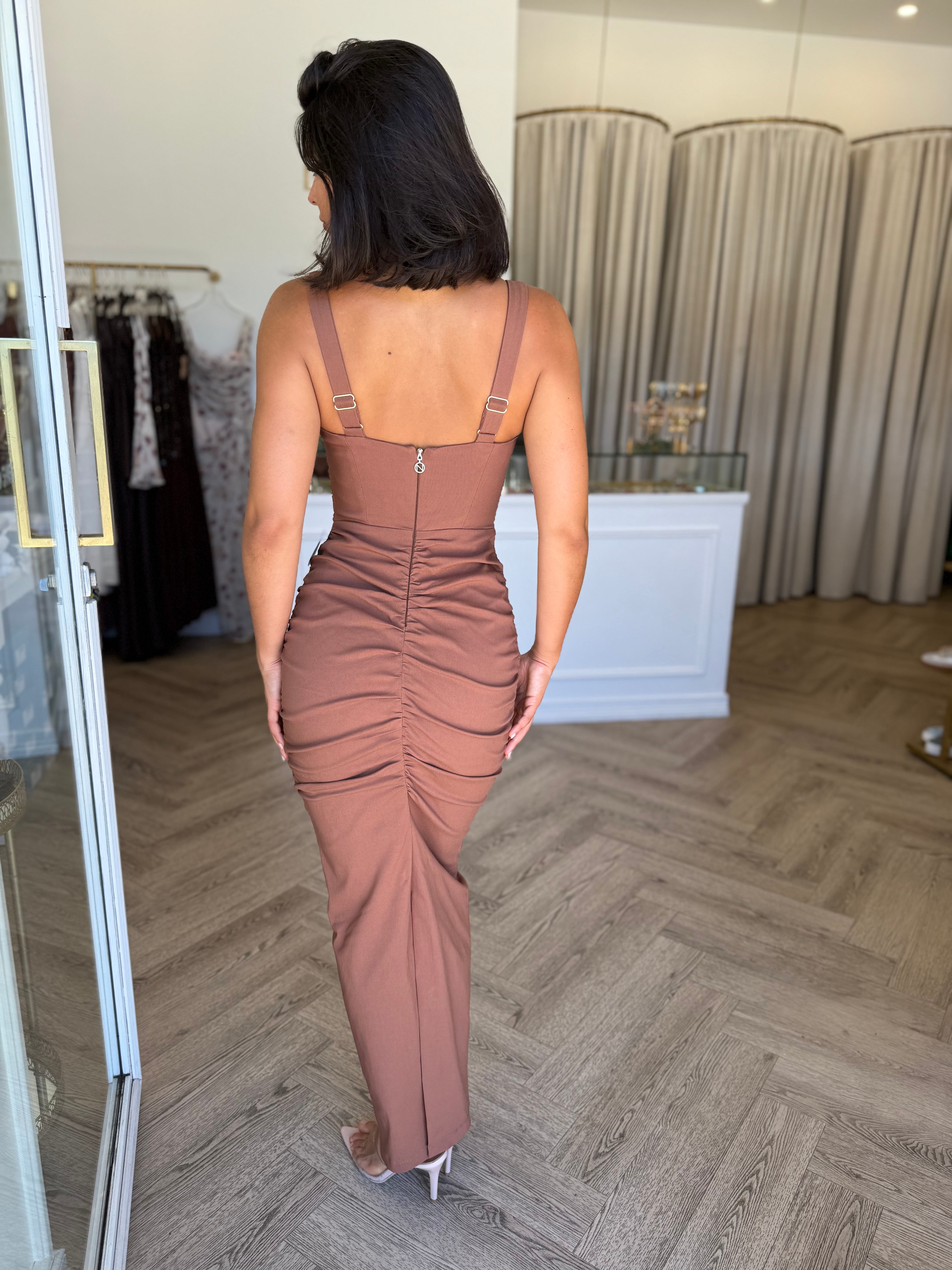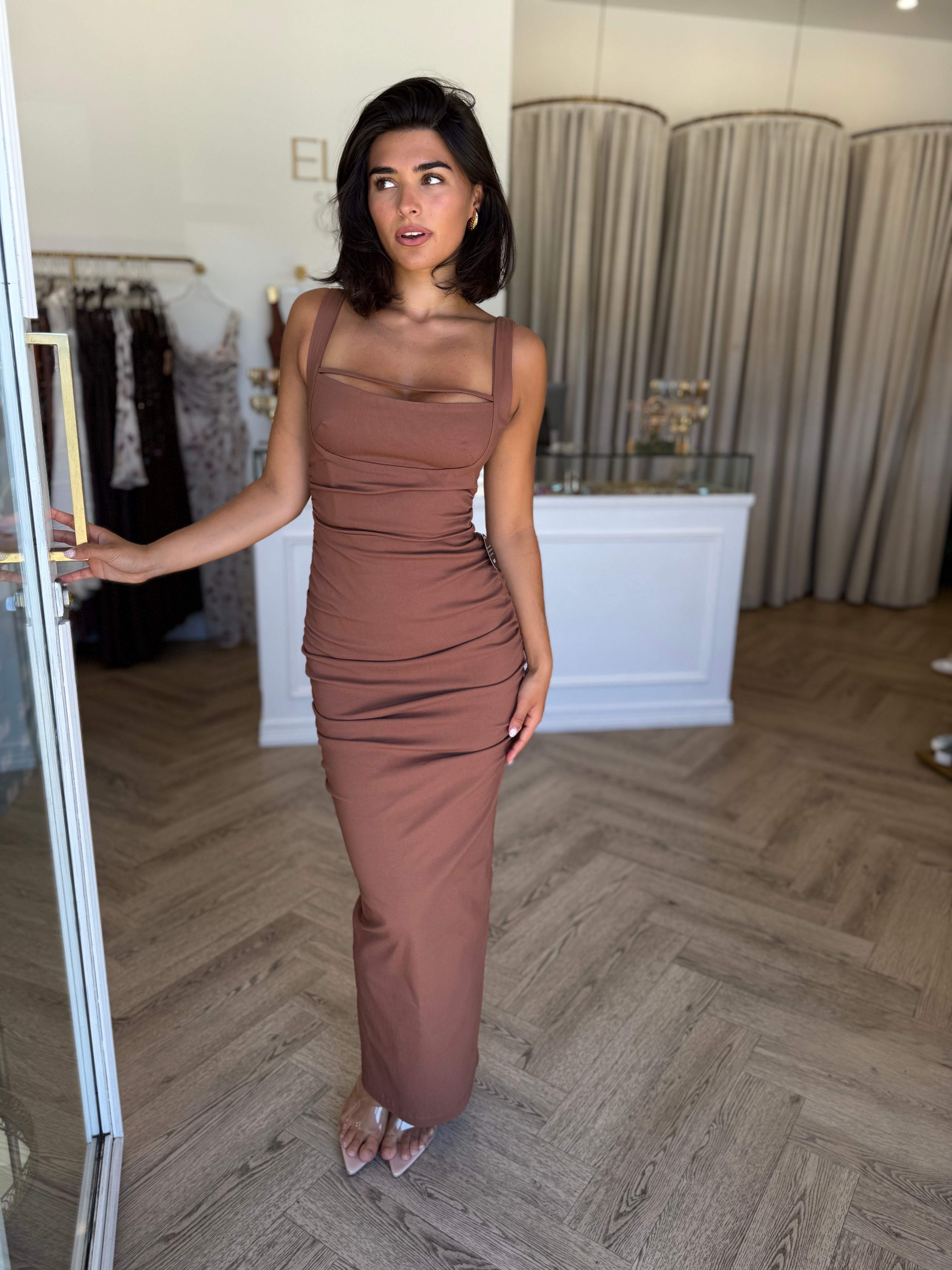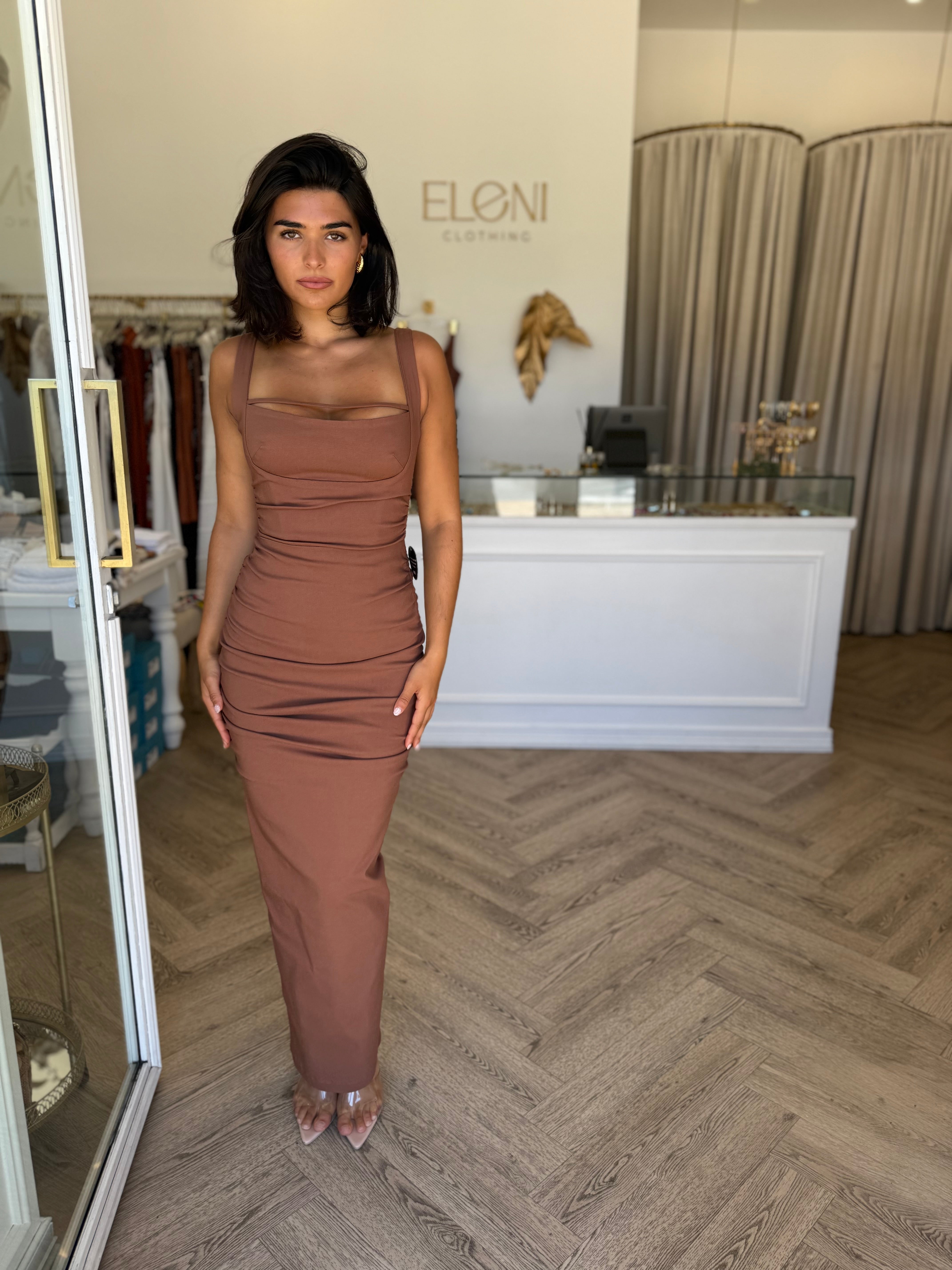 Ultra-feminine signature Nookie silhouette, featuring a striking square neckline with cut-out detail over bust and flattering ruching throughout. Featuring wide straps and a structured bodice for the perfect fit. Invisible zip at back and split at back hem. Cut from luxe stretch cotton, partially lined.