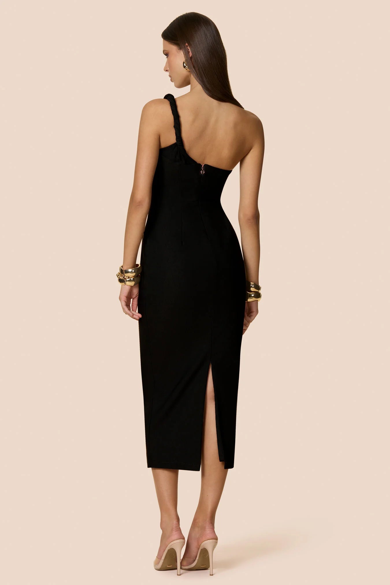 A bold asymmetrical silhouette that is as effortless as it is striking. Designed in our signature stretch cotton for structure and fit, it features a single shoulder with twisted detail, and tucks that cinch the waist and contours the body. Invisible zip closure and back split, fully lined.