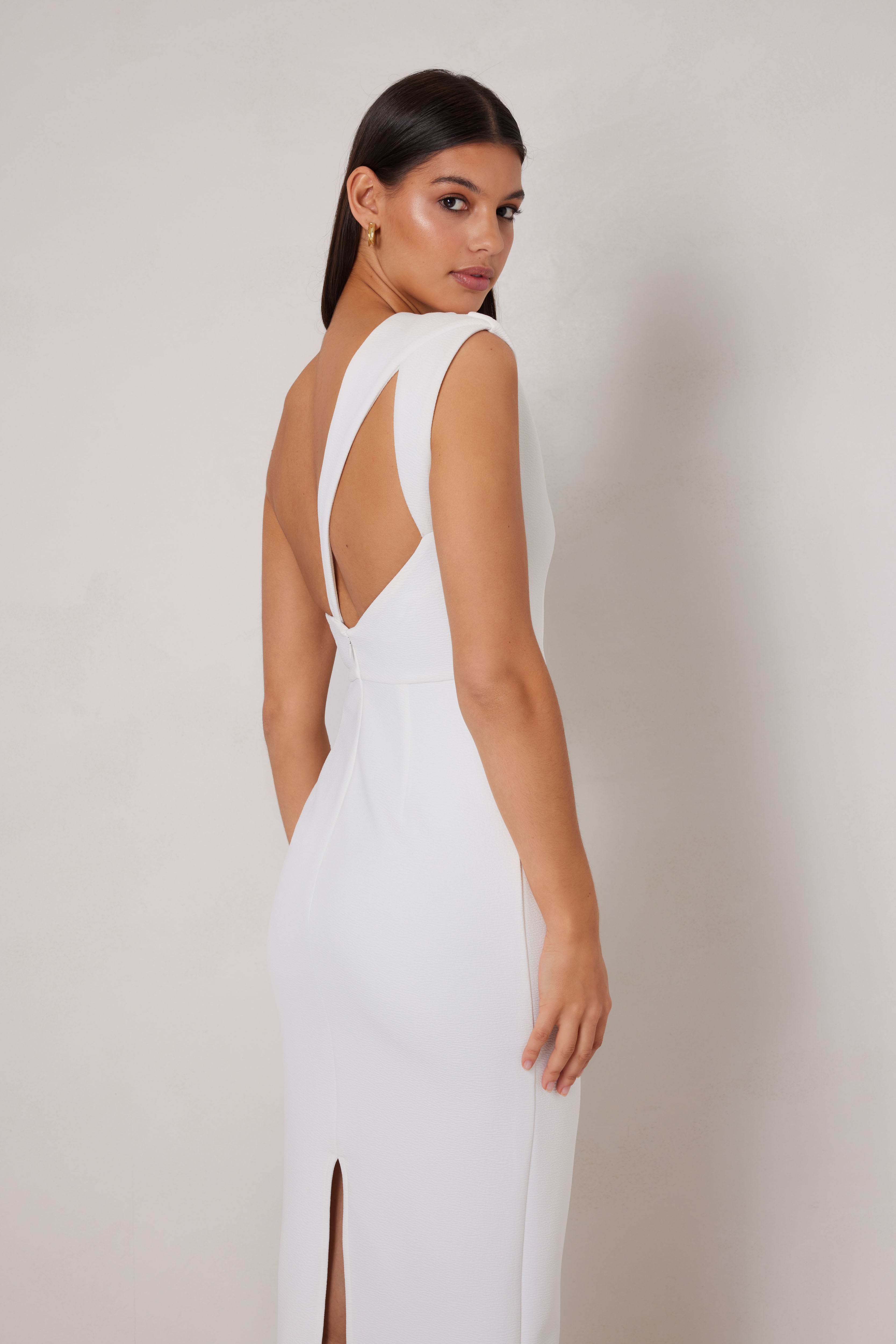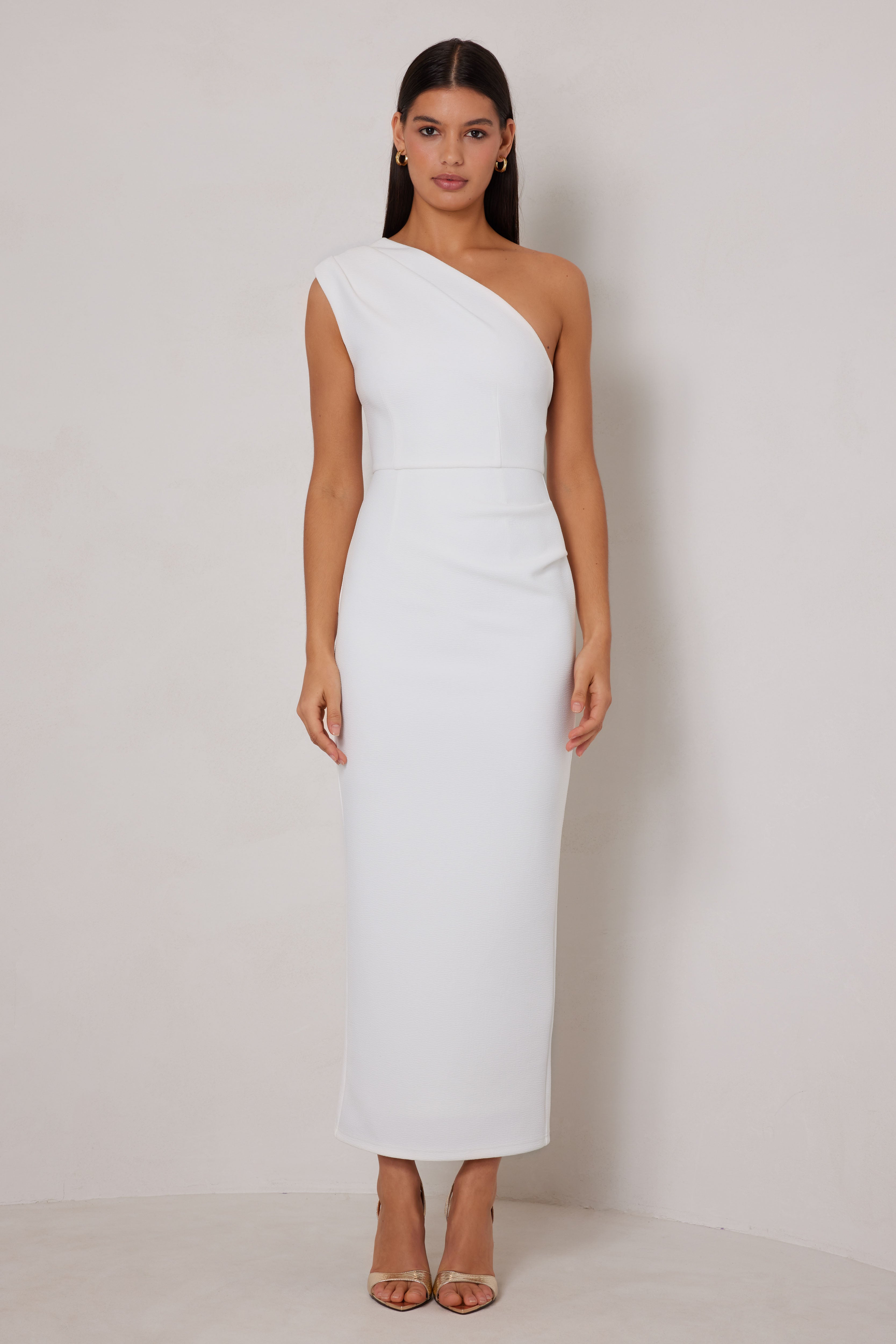 Cut in a sleek silhouette, this midi-length dress features a sophisticated one-shoulder design with a subtle draping detail on the shoulder. The back showcases a unique cut-out detail. Also available in Plum &