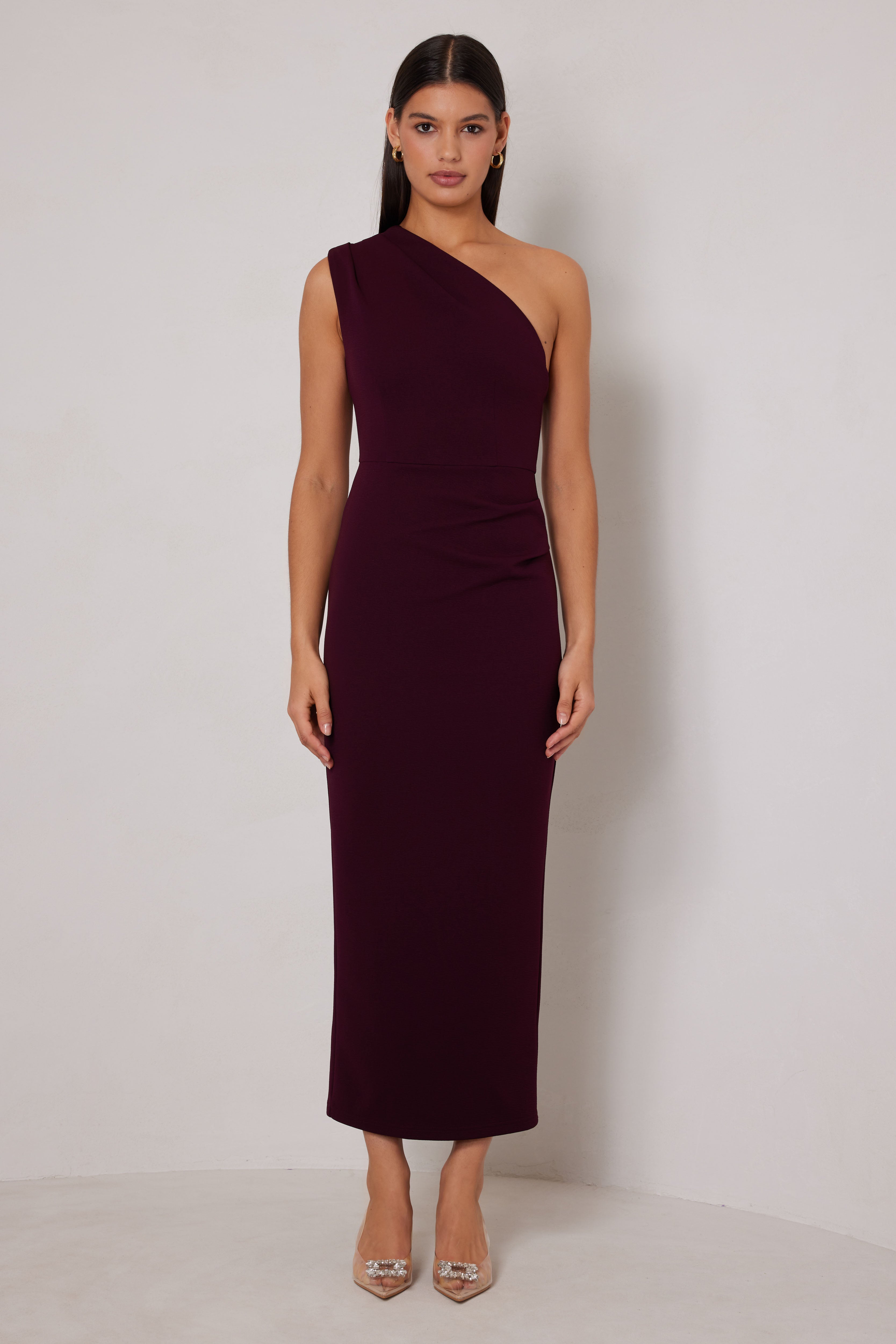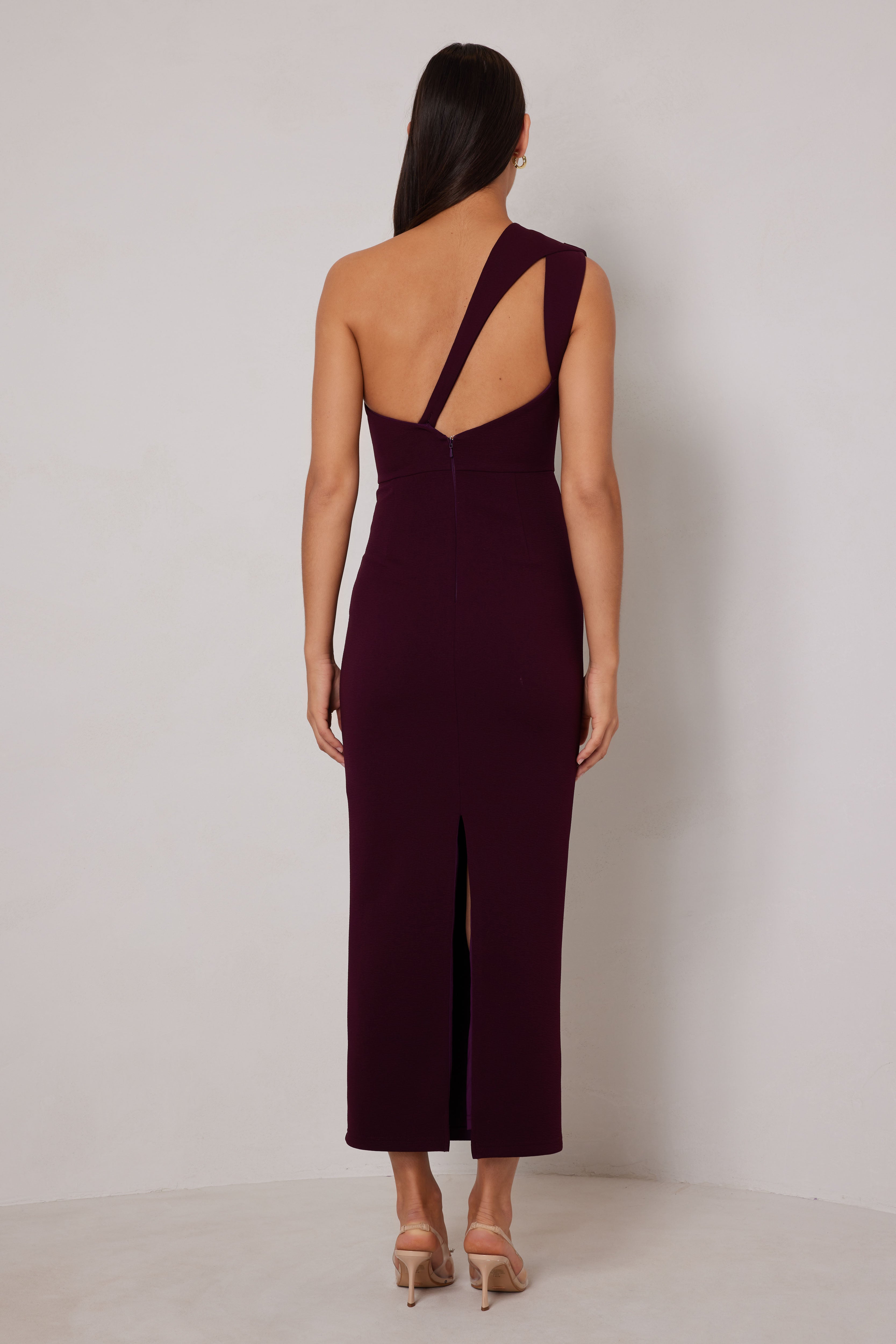 Cut in a sleek silhouette, this midi-length dress features a sophisticated one-shoulder design with a subtle draping detail on the shoulder. The back showcases a unique cut-out detail. Also available in White