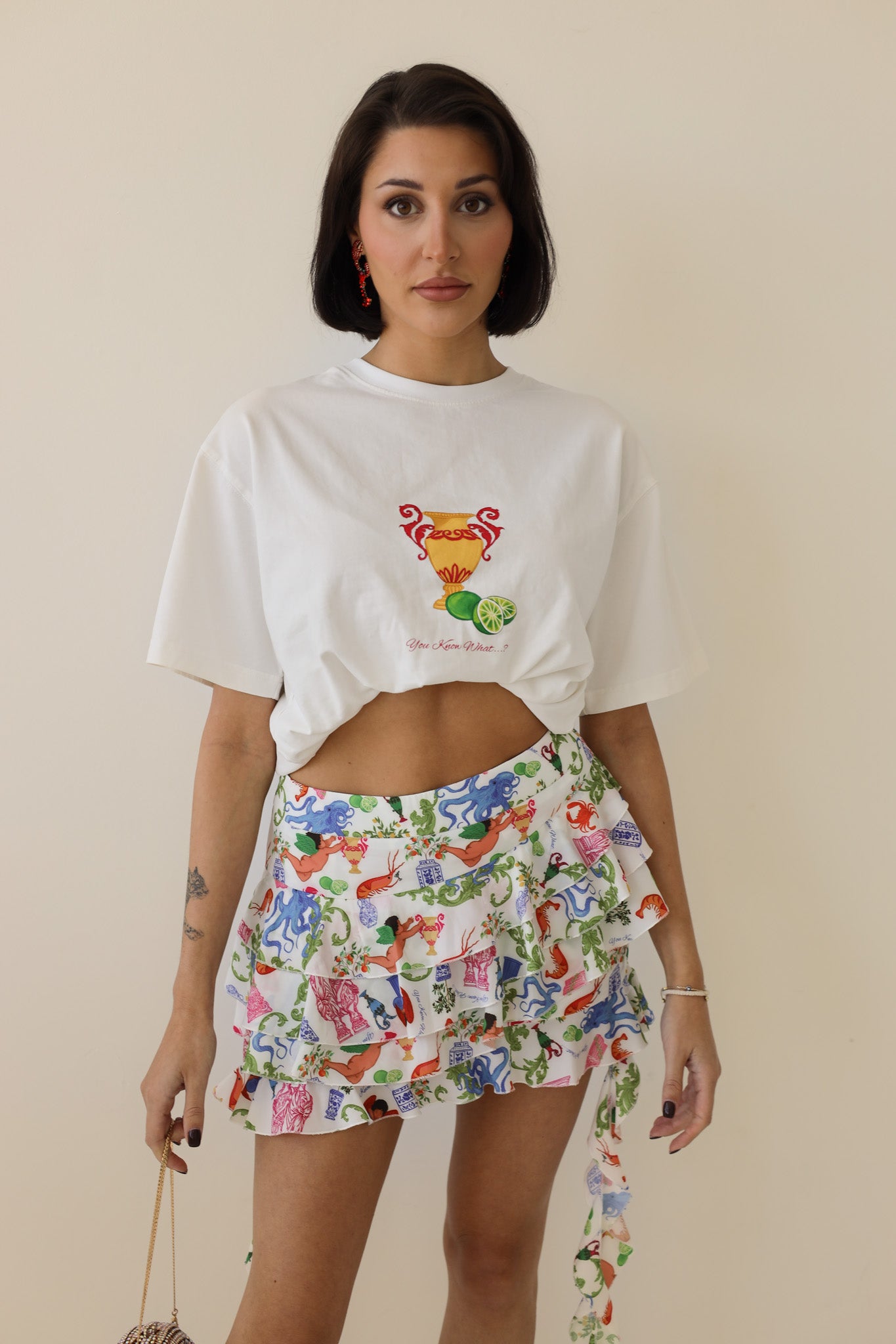 The Katrina Mini Skirt Feminine with a touch of drama. Crafted in a custom Aegean Dreams printed fabric and fully lined for comfort, this mini features cascading frills down each side, creating a fluid mermaid inspired silhouette. Finished with a side seam zipper and hook and eye closure, it’s playful, flattering, and designed to make every entrance unforgettable.
