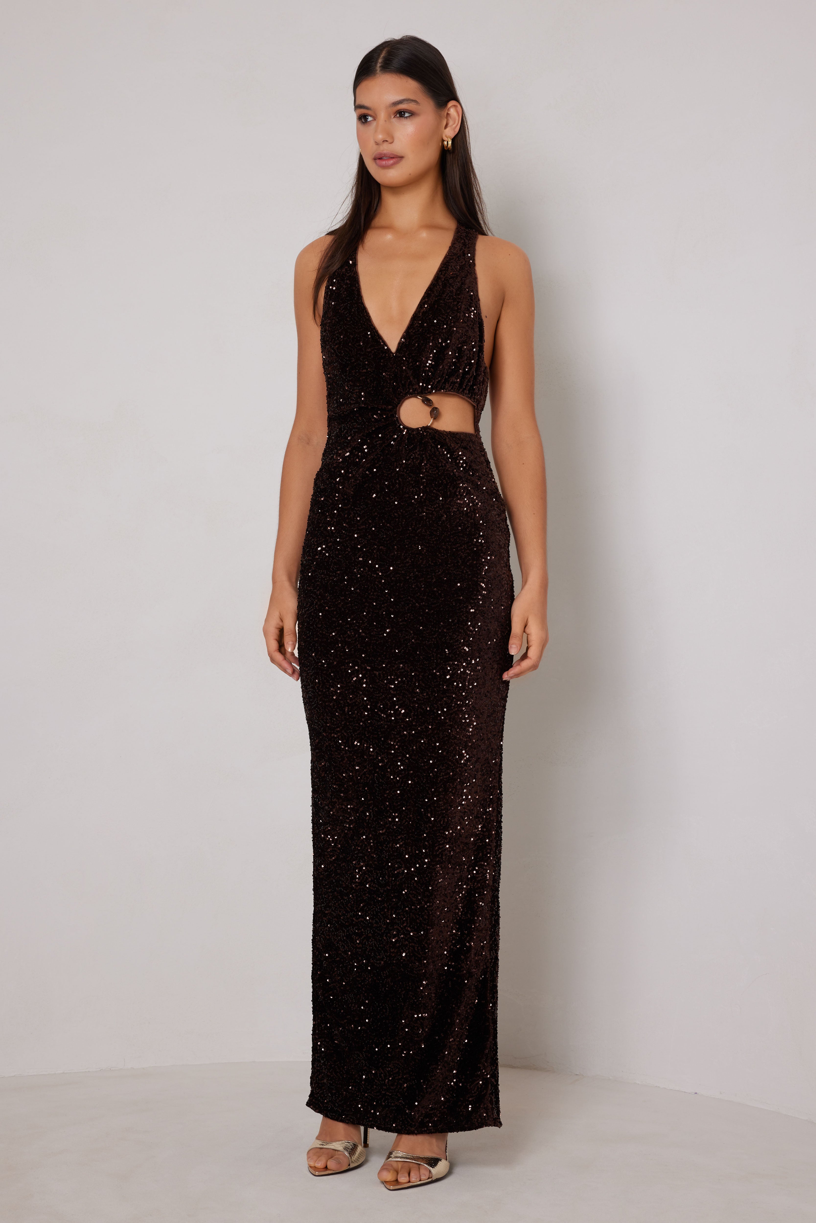 A sparkling, form-fitting gown with a bold, cut-out detail at the waist. The deep V-neck and statement open back perfect for making a statement.