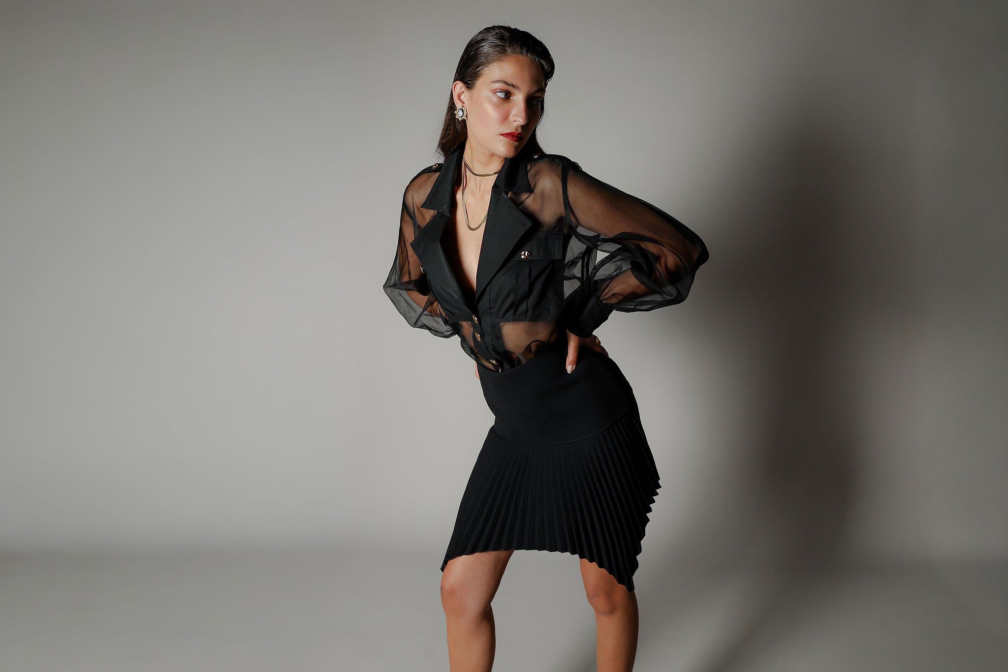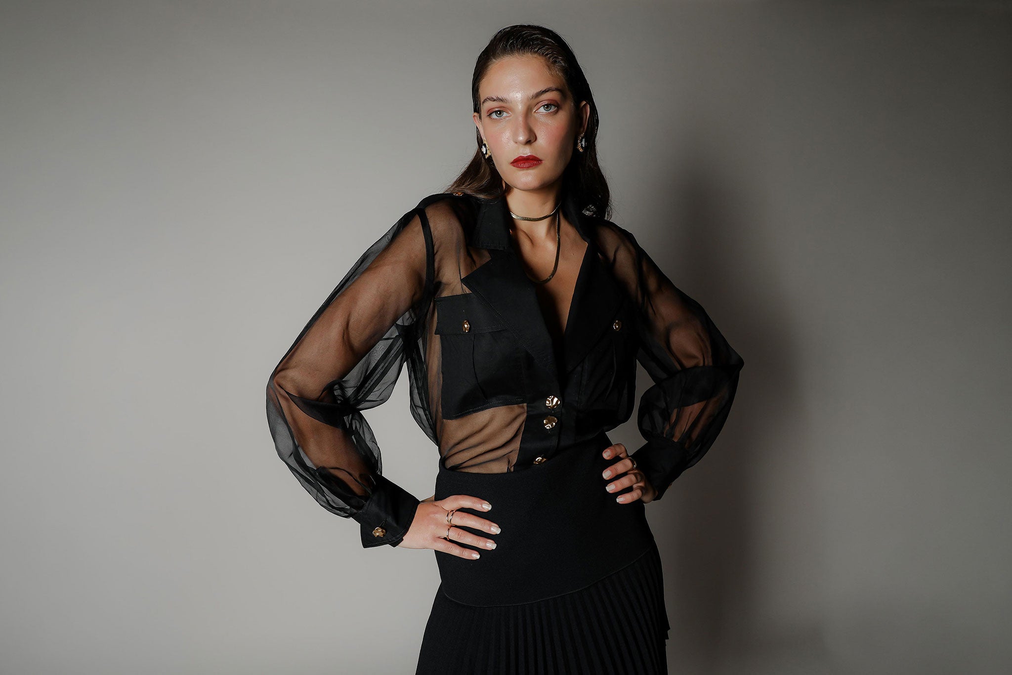 Crafted from sheer silk organza and contrasting lightweight cotton voile, this statement blouse blends tailored structure with soft transparency for a modern, elevated silhouette. Designed with a sharp lapel collar and soft sculptural volume through the sleeves, it features satin-finish gold buttons, front pockets, and front button closure.