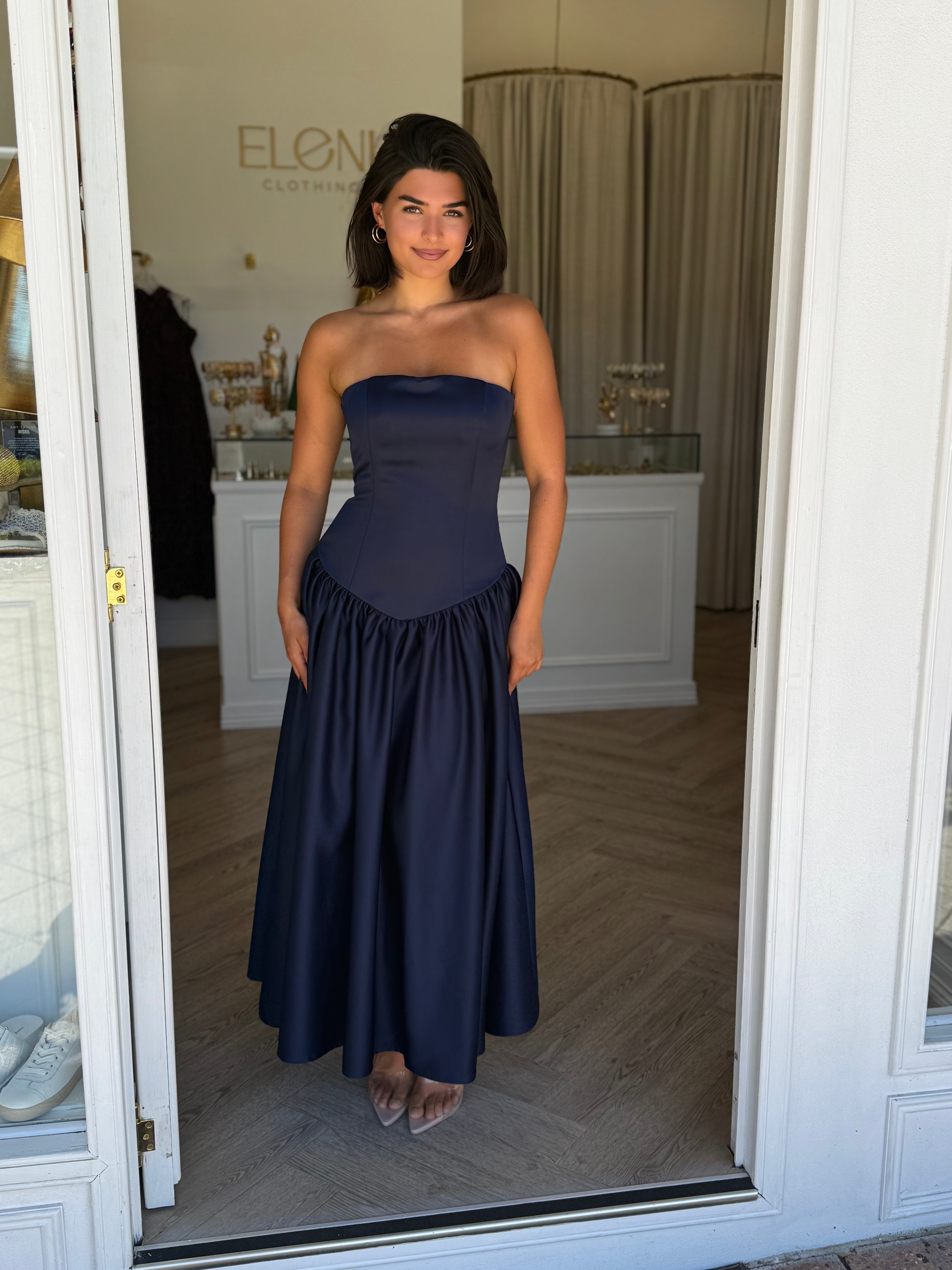 Make a statement with this elegant strapless midi dress, crafted for modern sophistication. The fitted bodice provides a sleek and flattering silhouette, transitioning into a voluminous, gathered skirt that adds playful movement. Also available in White