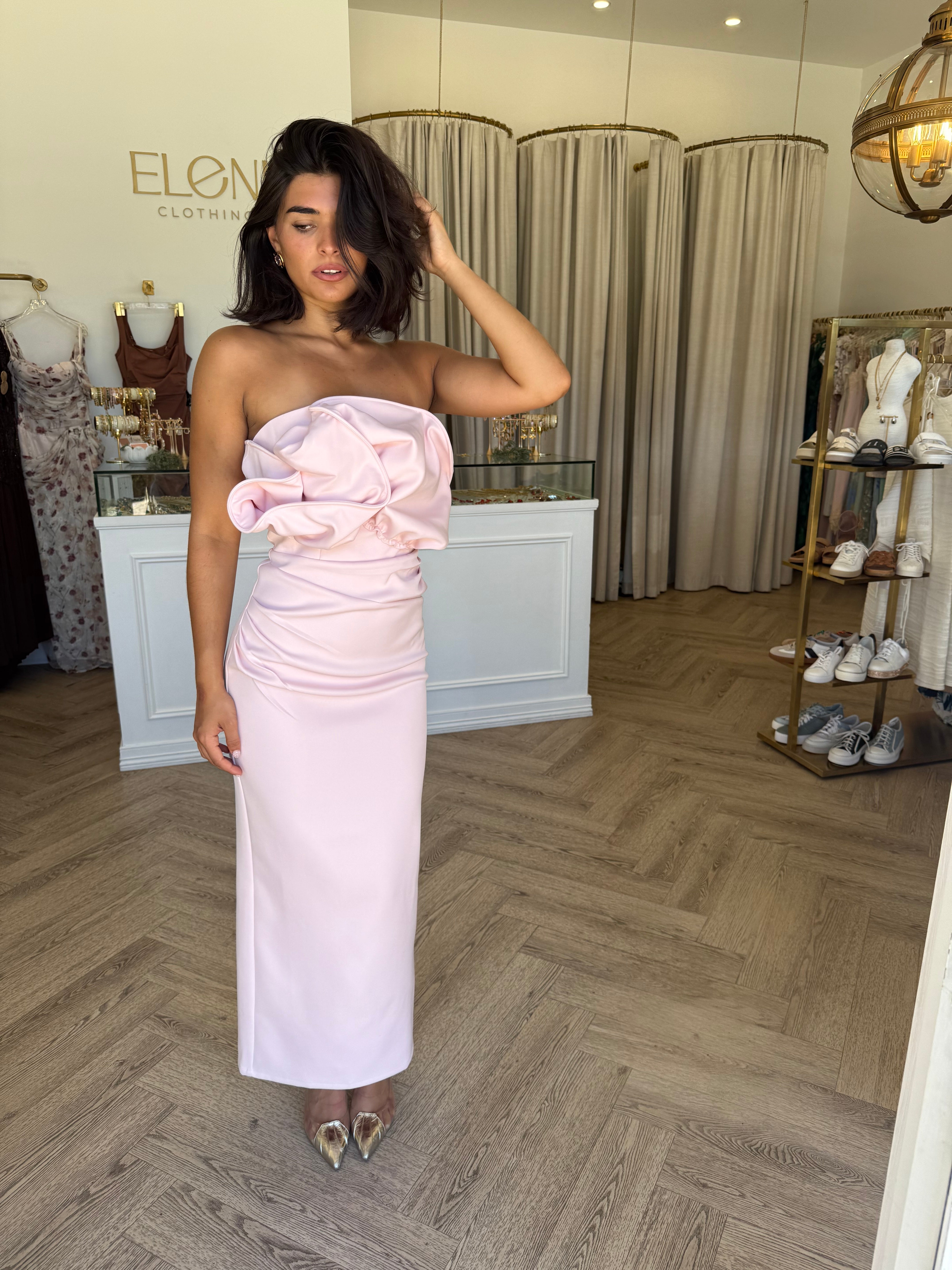 The Miles dress is an elegant, floor-length gown features a show stopping 3D effect, creating an oversized sculptural feature.