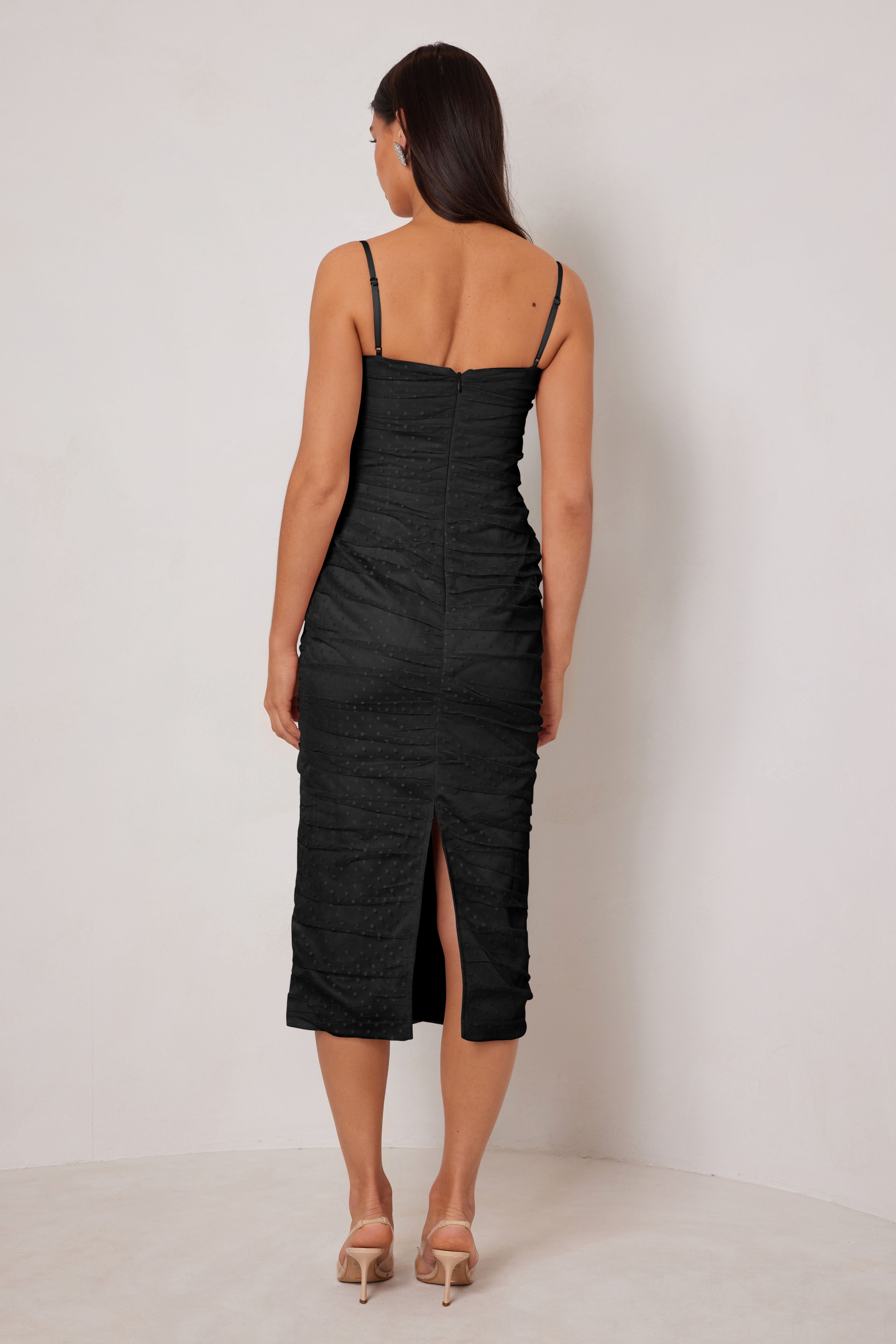This form-fitting midi dress features corset bodice and tulle polka dot overlay making this dress perfect for a night out. Also available in blush