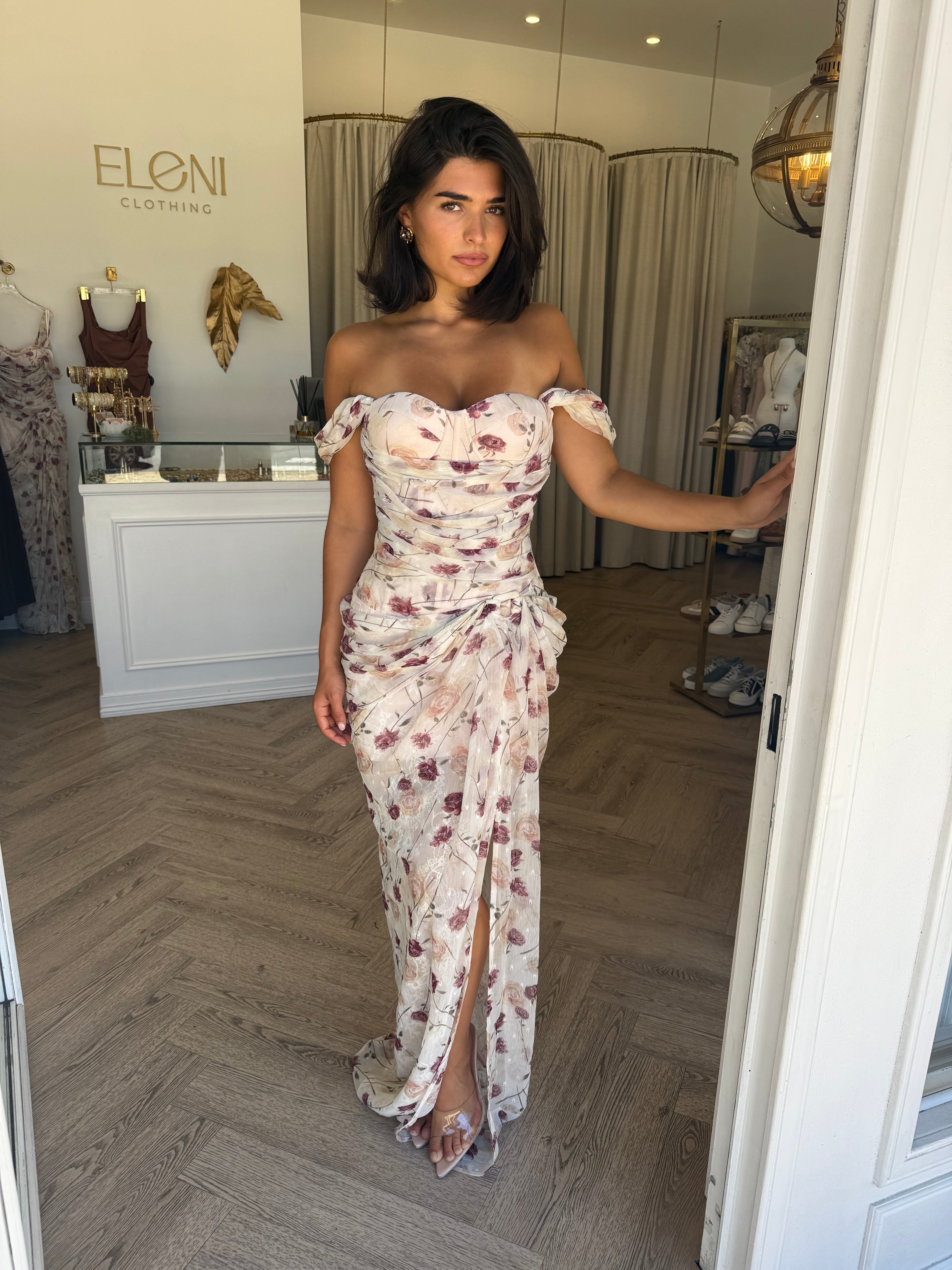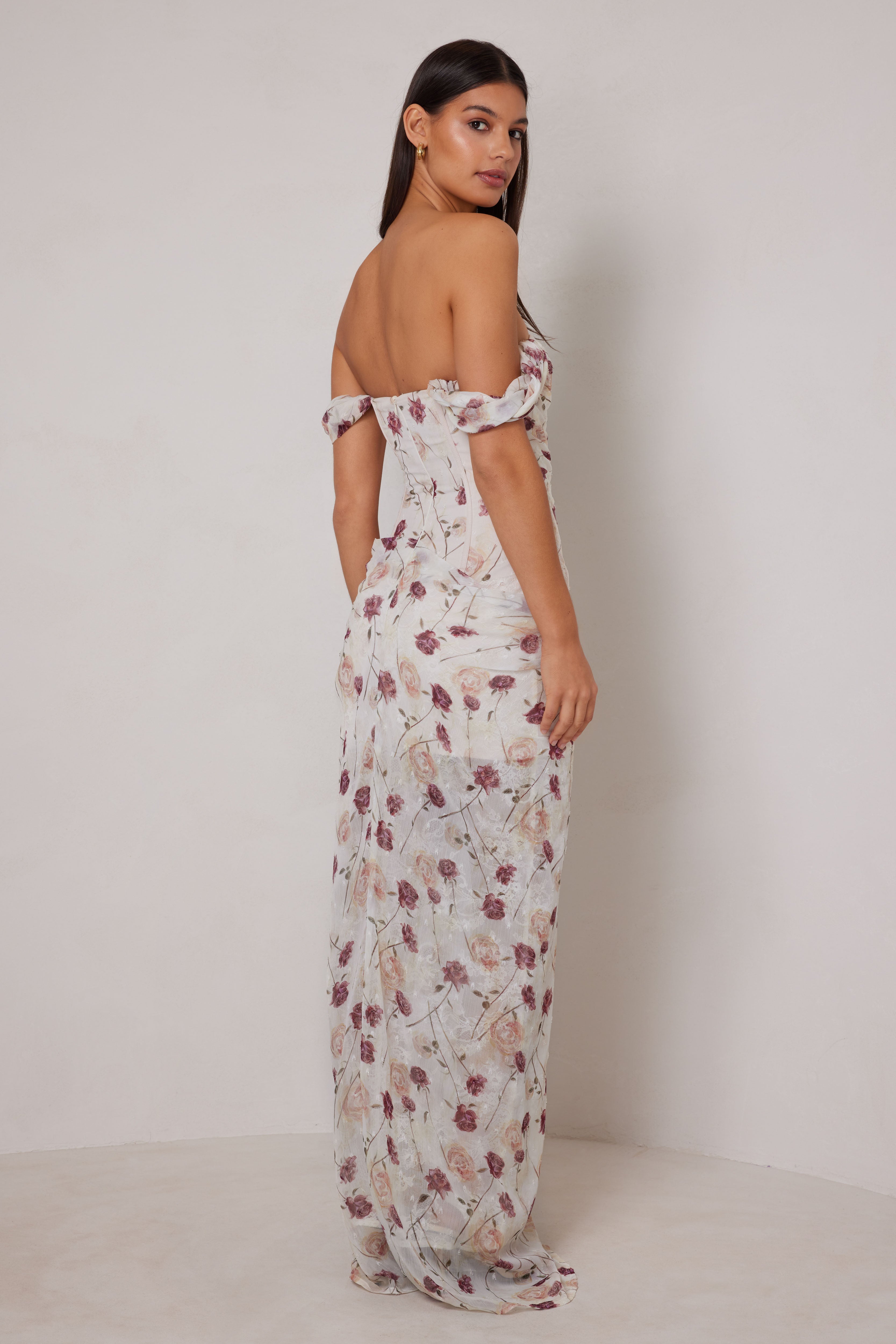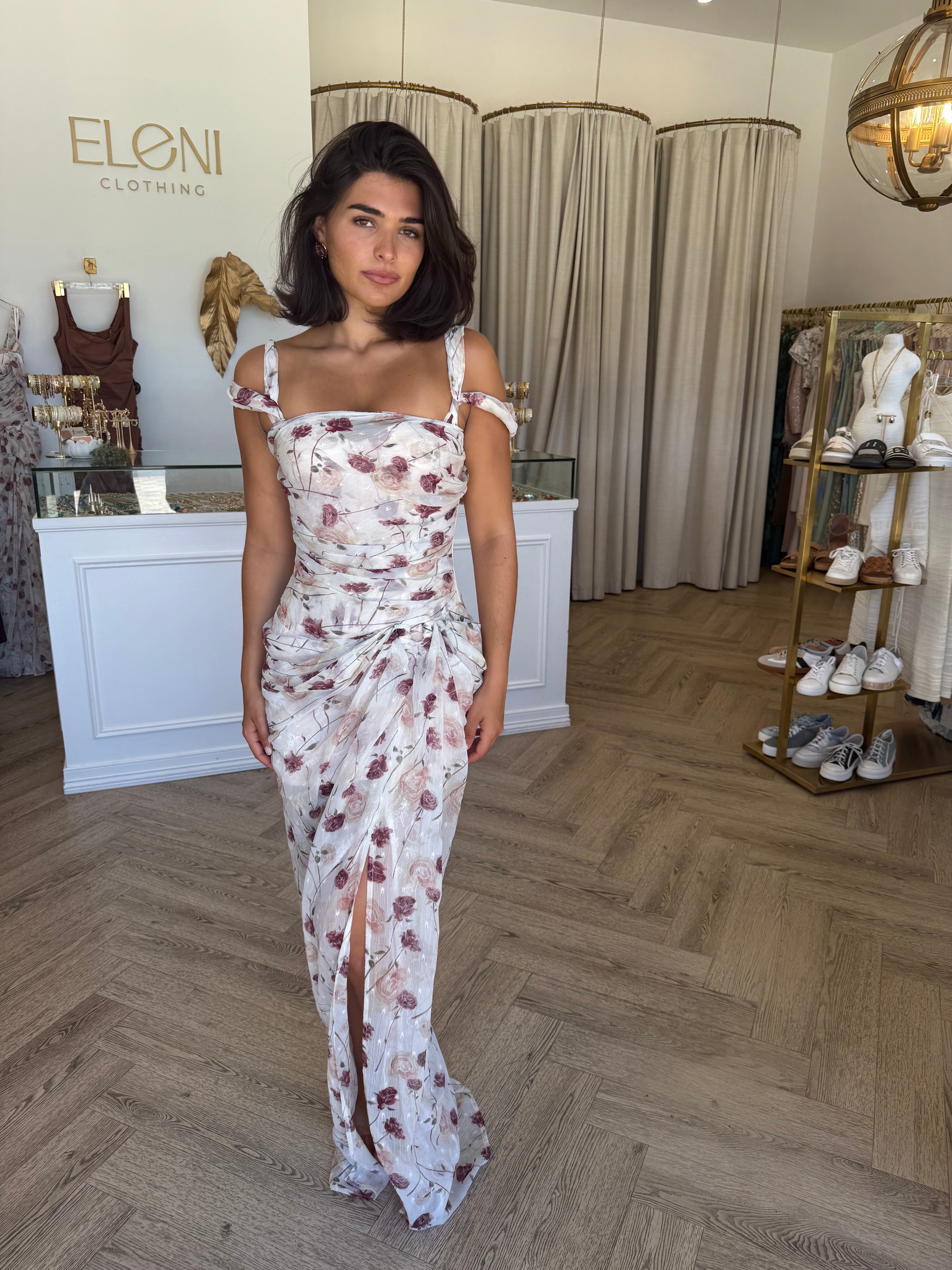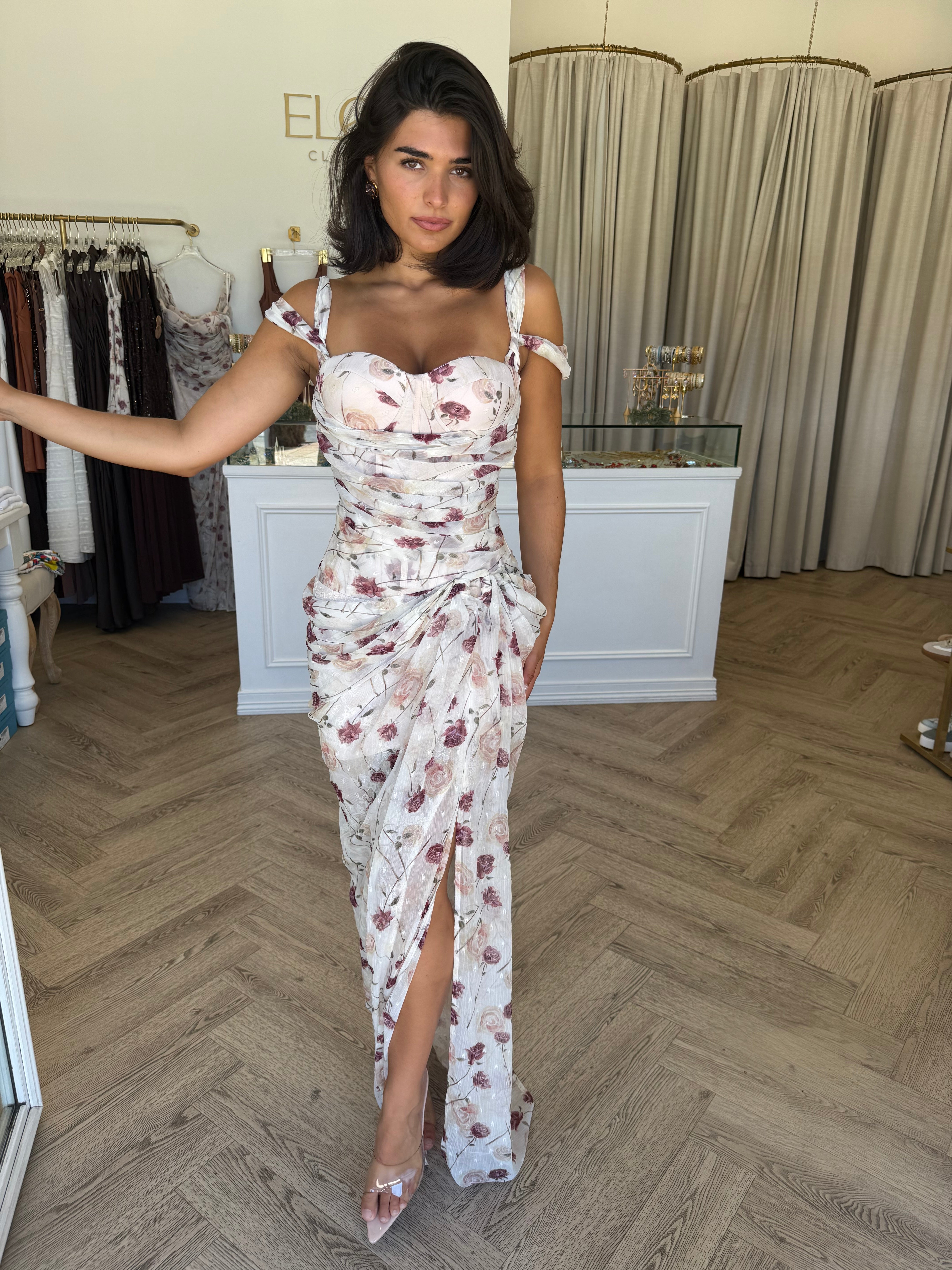 A vintage rose print is draped to perfection. Layers of lace and tulle add a romantic texture, while the flattering silhouette drapes beautifully. This dress effortlessly combines modern chic with timeless elegance.