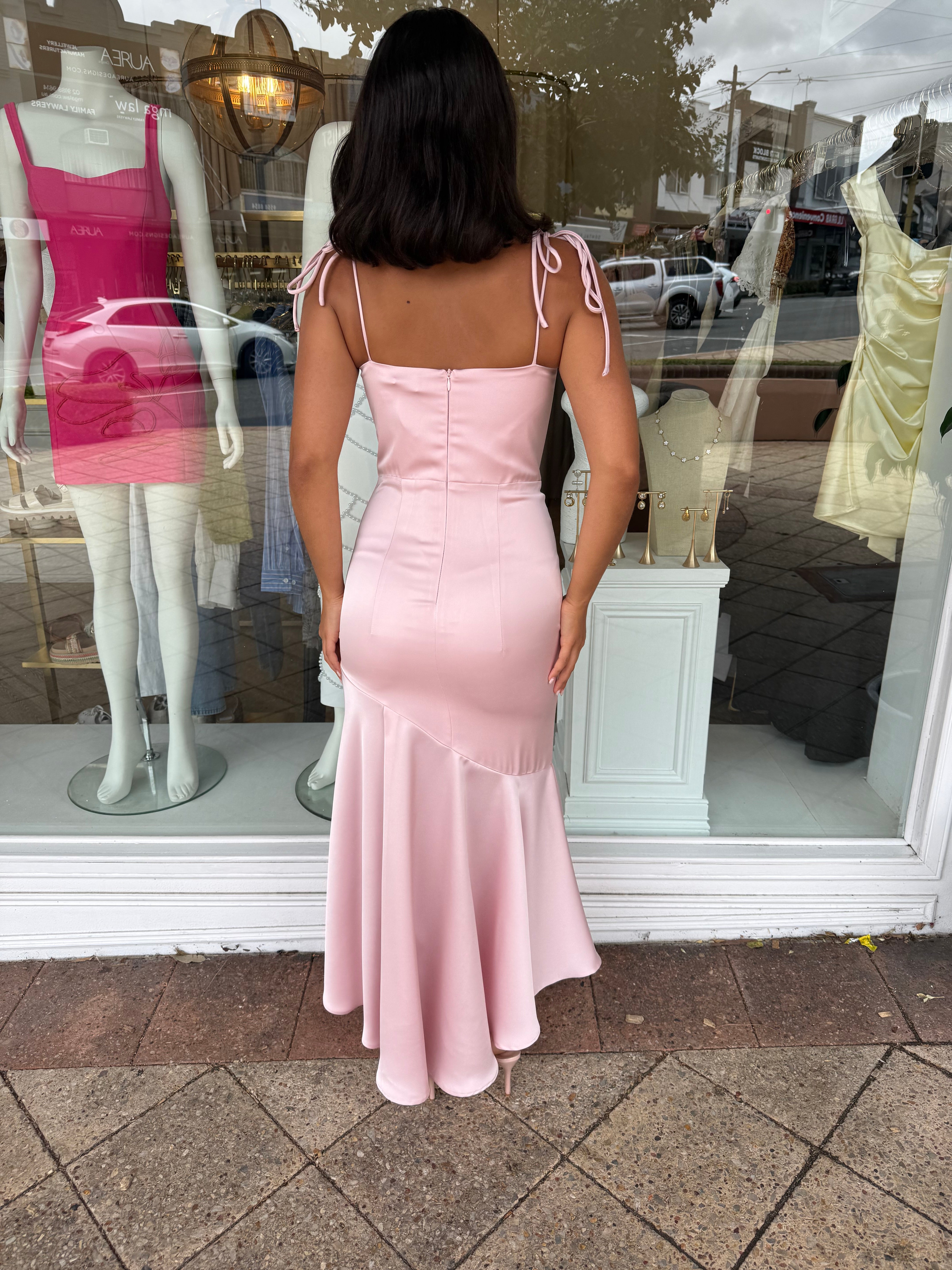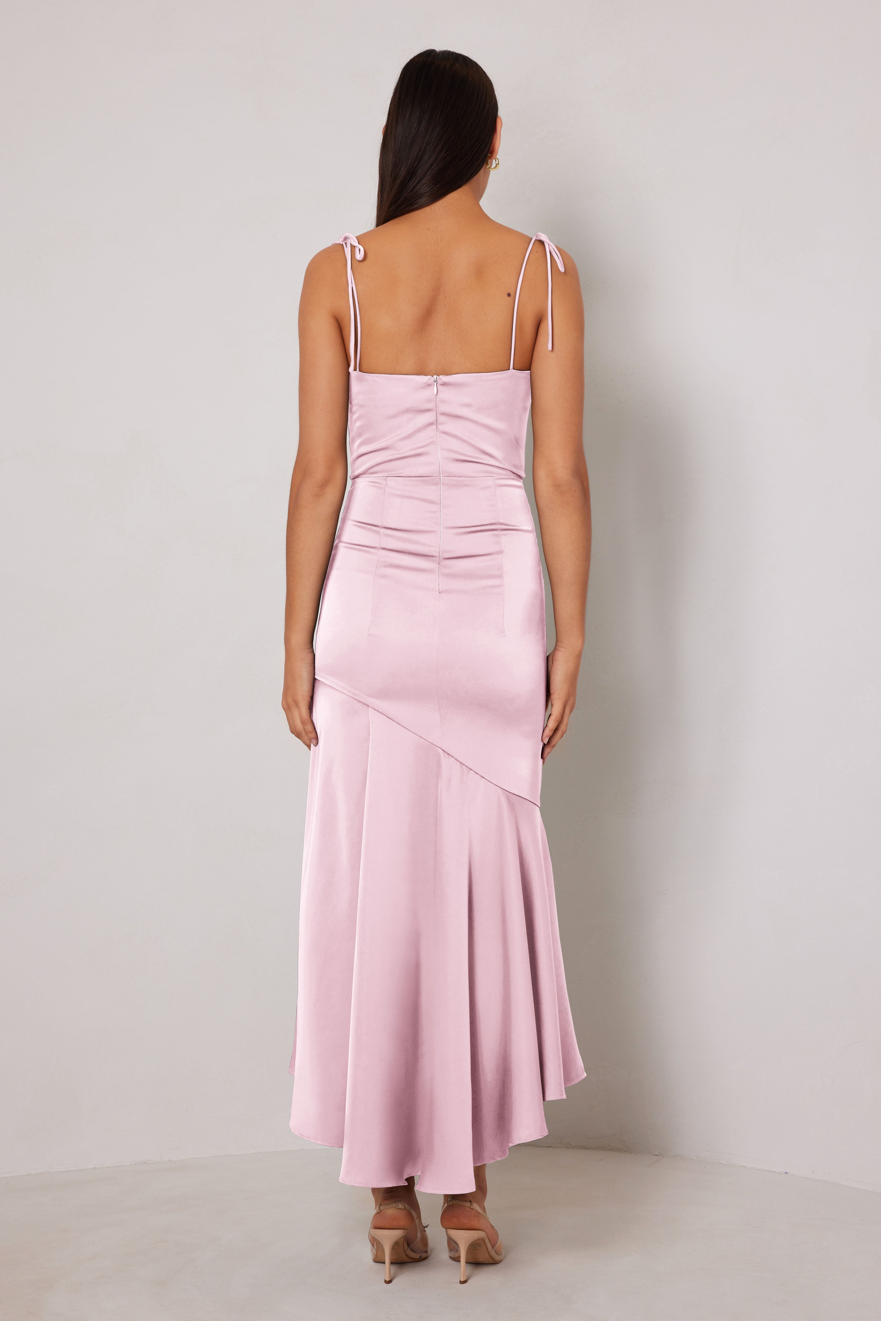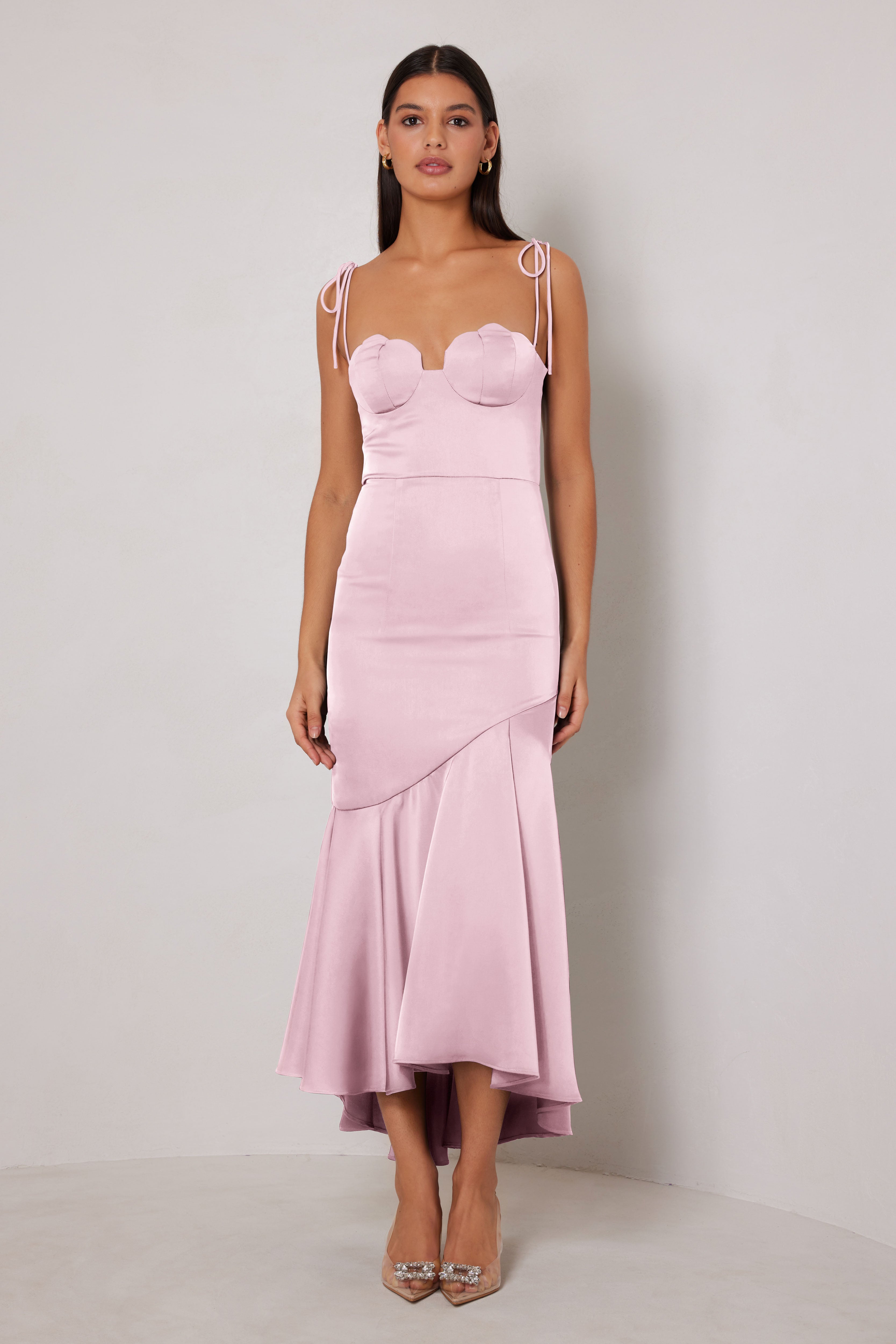 This midi-length dress features a unique sweetheart neckline with delicate self-tie straps. The fitted silhouette flows into a dynamic, asymmetrical skirt with a cascading ruffle detail. Also available in Teal.