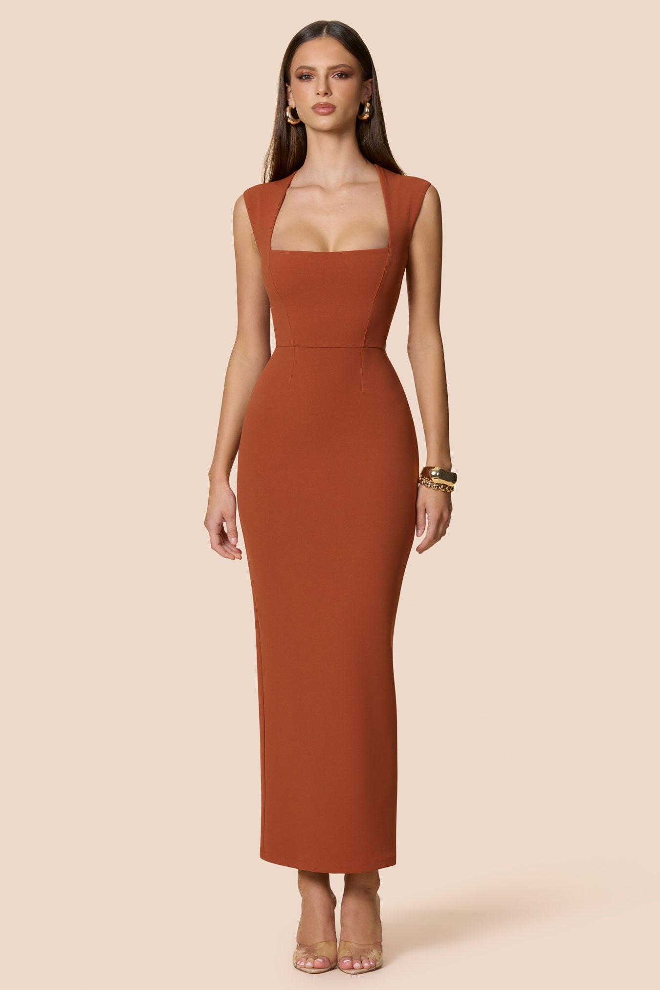 Beautiful midi with striking neckline, natched waist and the perfect long length. Crafted in our signature bonded...