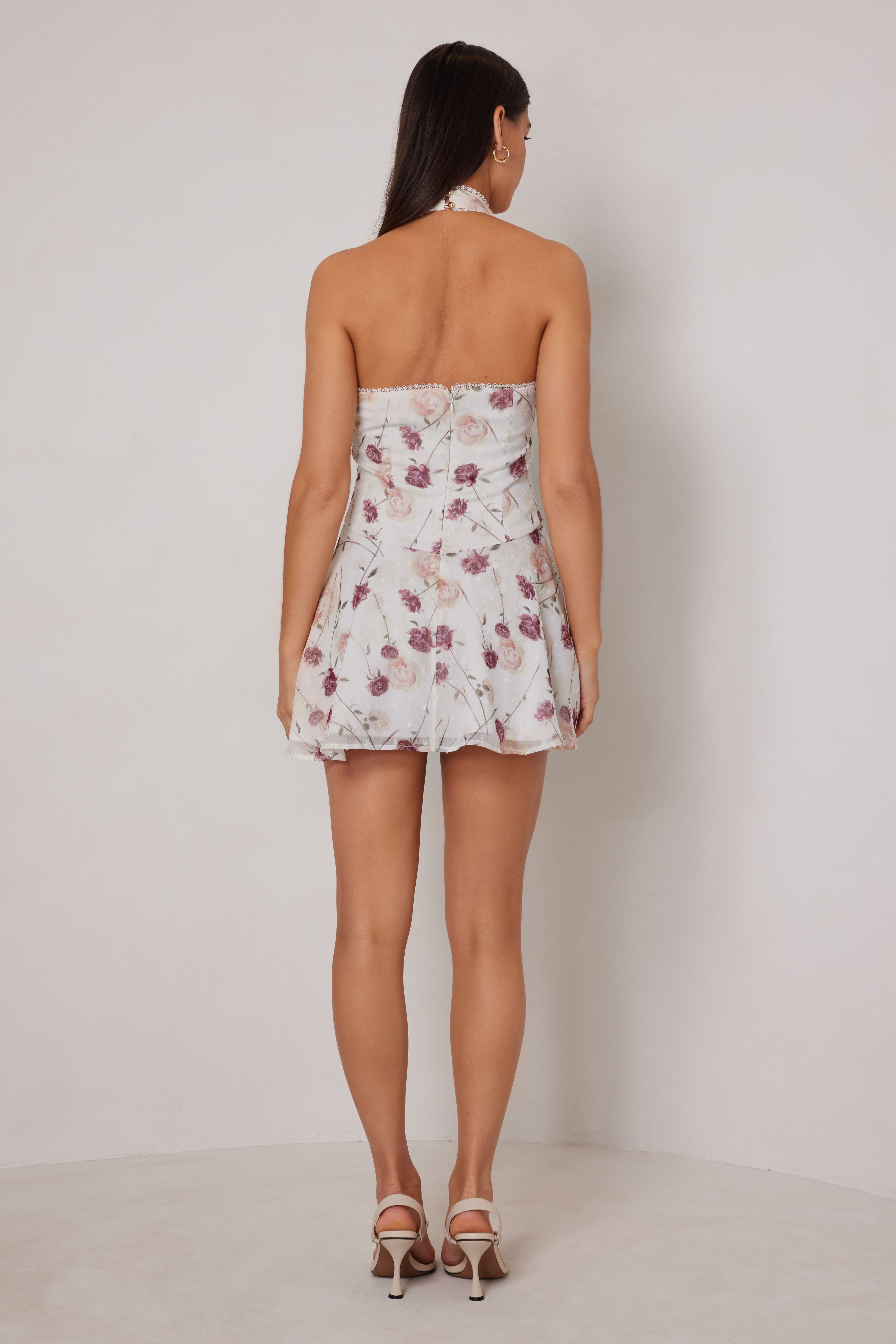 The Valinitina mini features a soft vintage floral print and halter neck design and floraty fun skirt. The dress also features a delicate trim on the neckline, perfect for a day to night event!