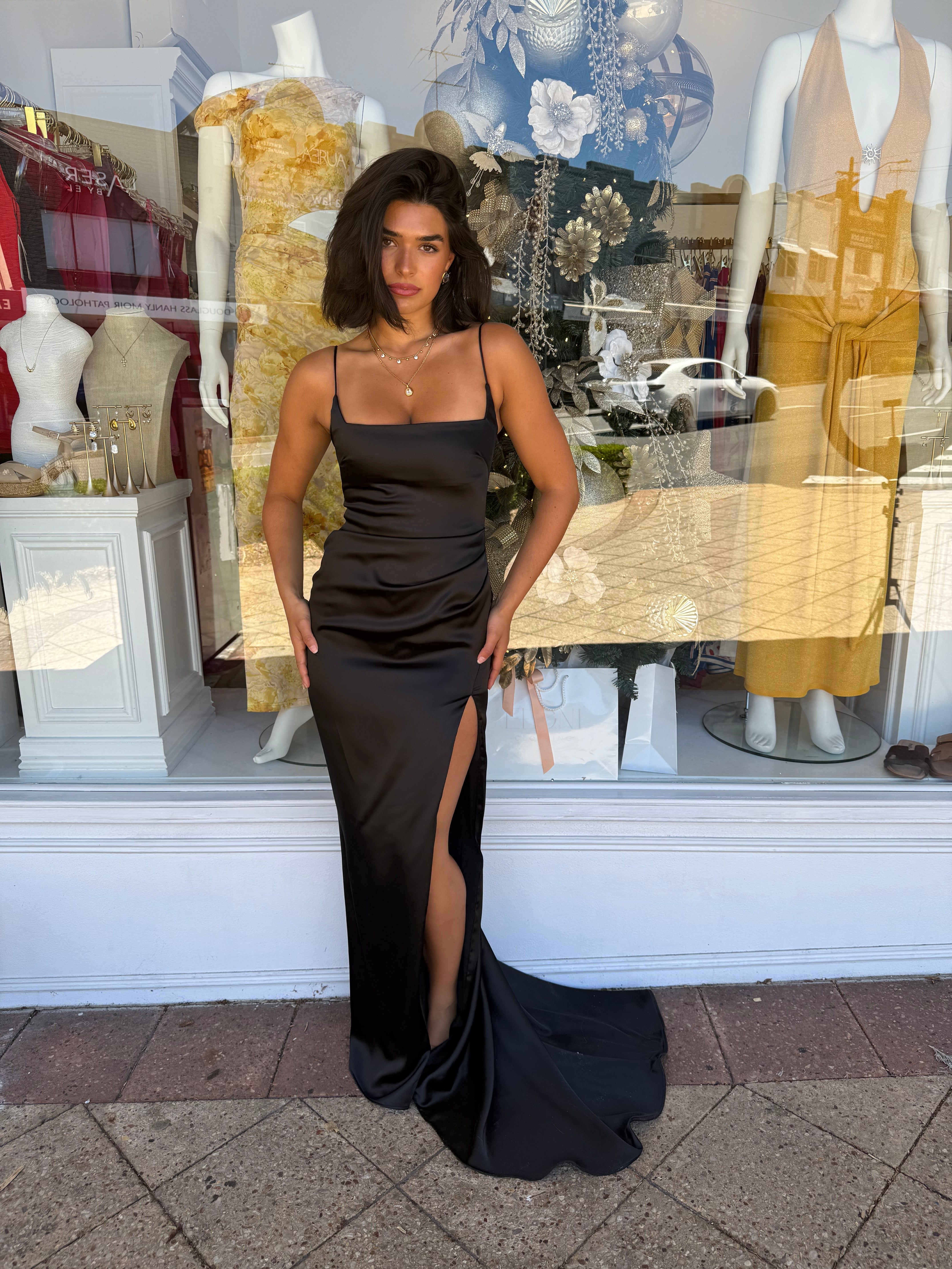 Show-stopping satin gown crafted from a luxe stretch satin. Flattering tucks at waist, thigh high split and elegant train at the back make this dress a statement piece for any event. Adjustable straps, fully lined.